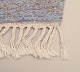 Vævet med geometriske felter i forskellige farver på blå og grøn bund.