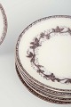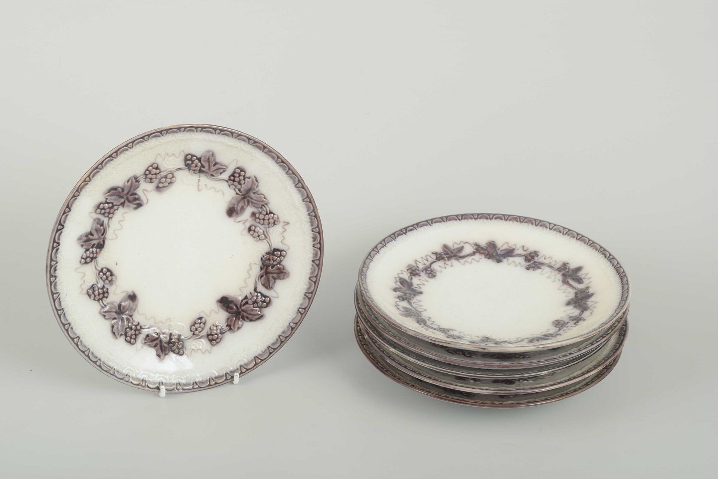 Set of 6 round faience plates with relief decoration and grapevine motif in a brownish tone along the rim.