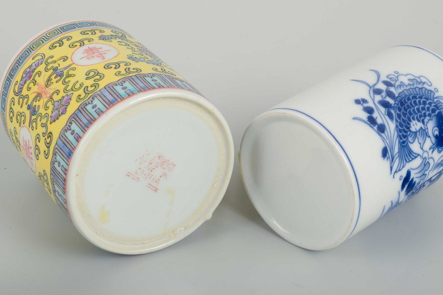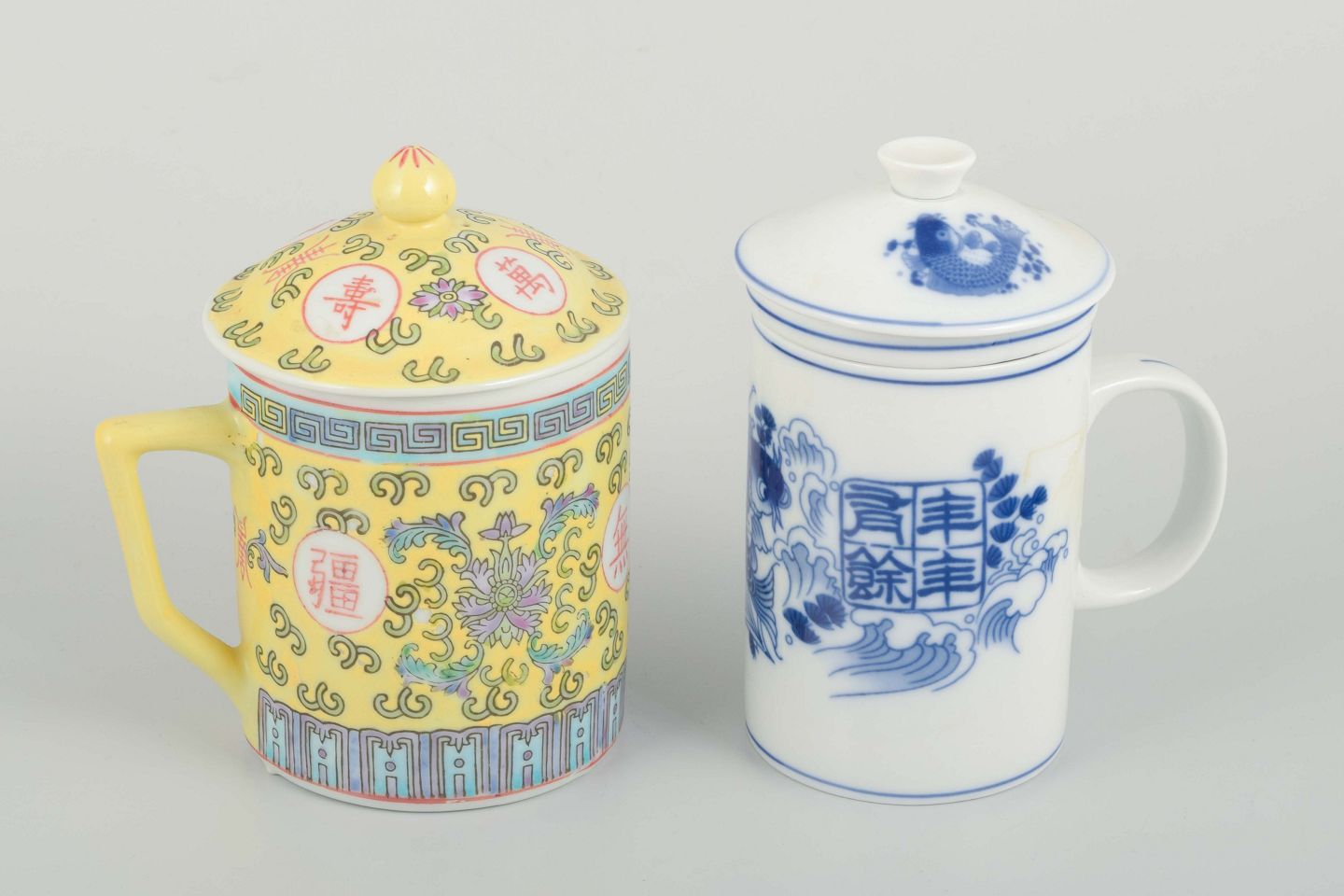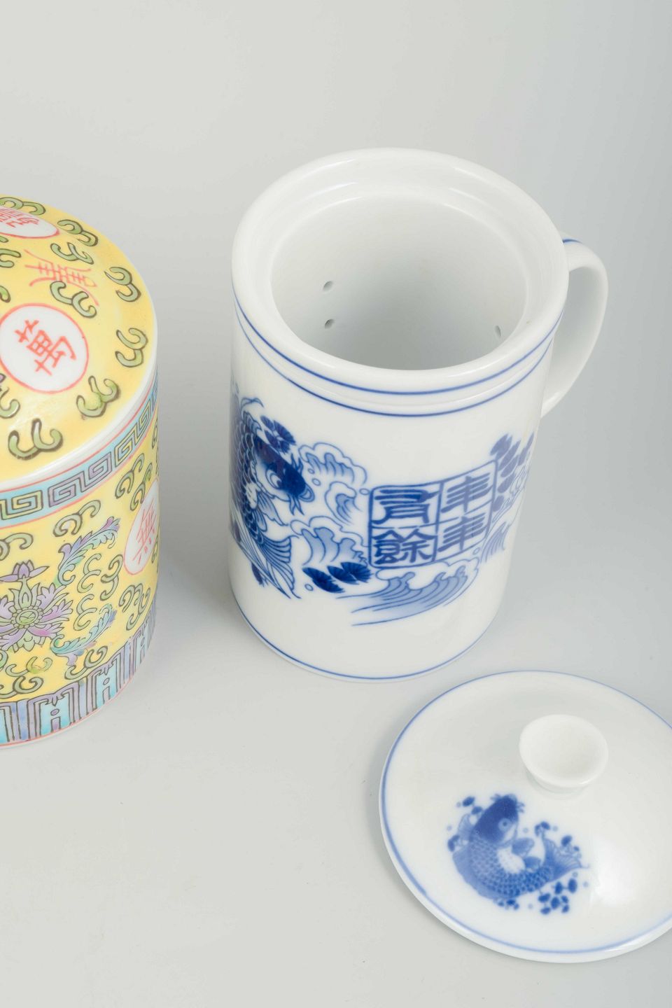Cylindrical porcelain cups with handles, each with lid and removable strainer. One decorated on a yellow ground with polychrome enamels and Chinese characters, the other in underglaze blue with fish motif and calligraphy.