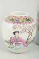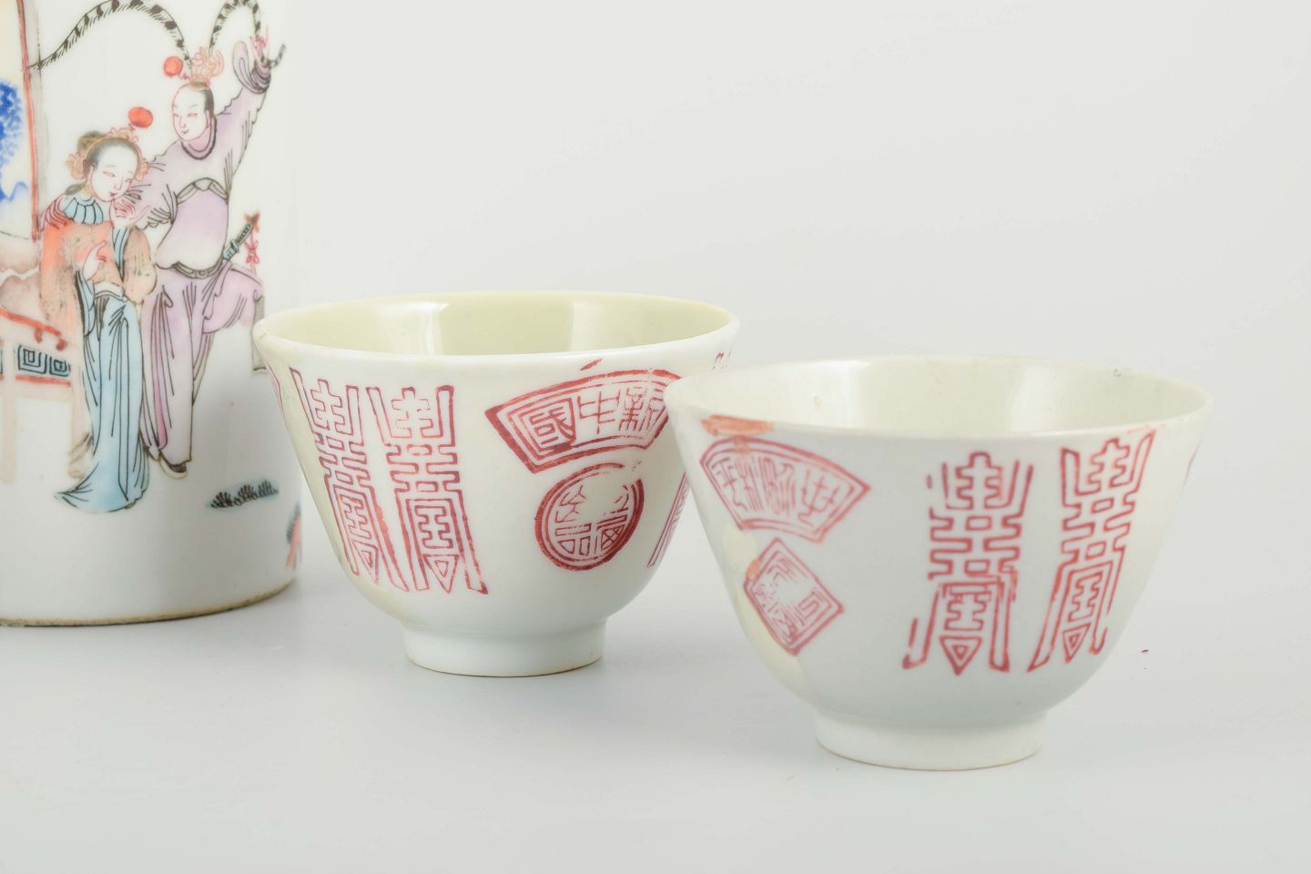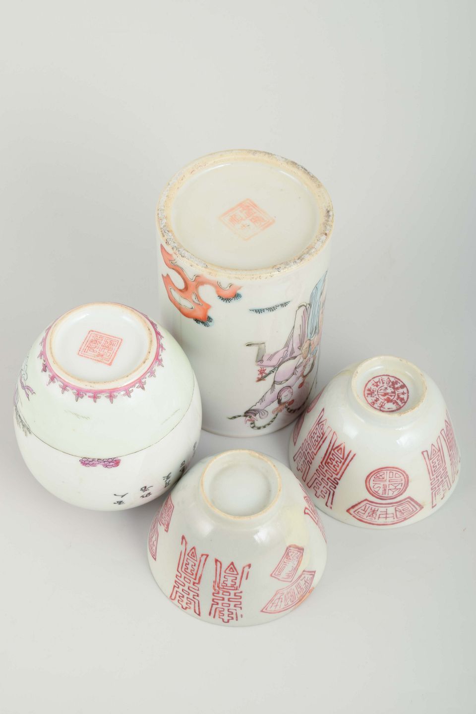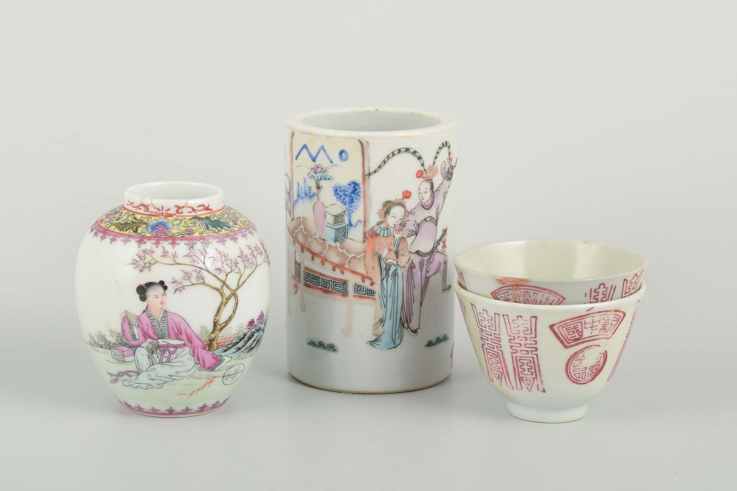 Porcelain decorated in famille rose and red print with figural scenes and calligraphic motifs.