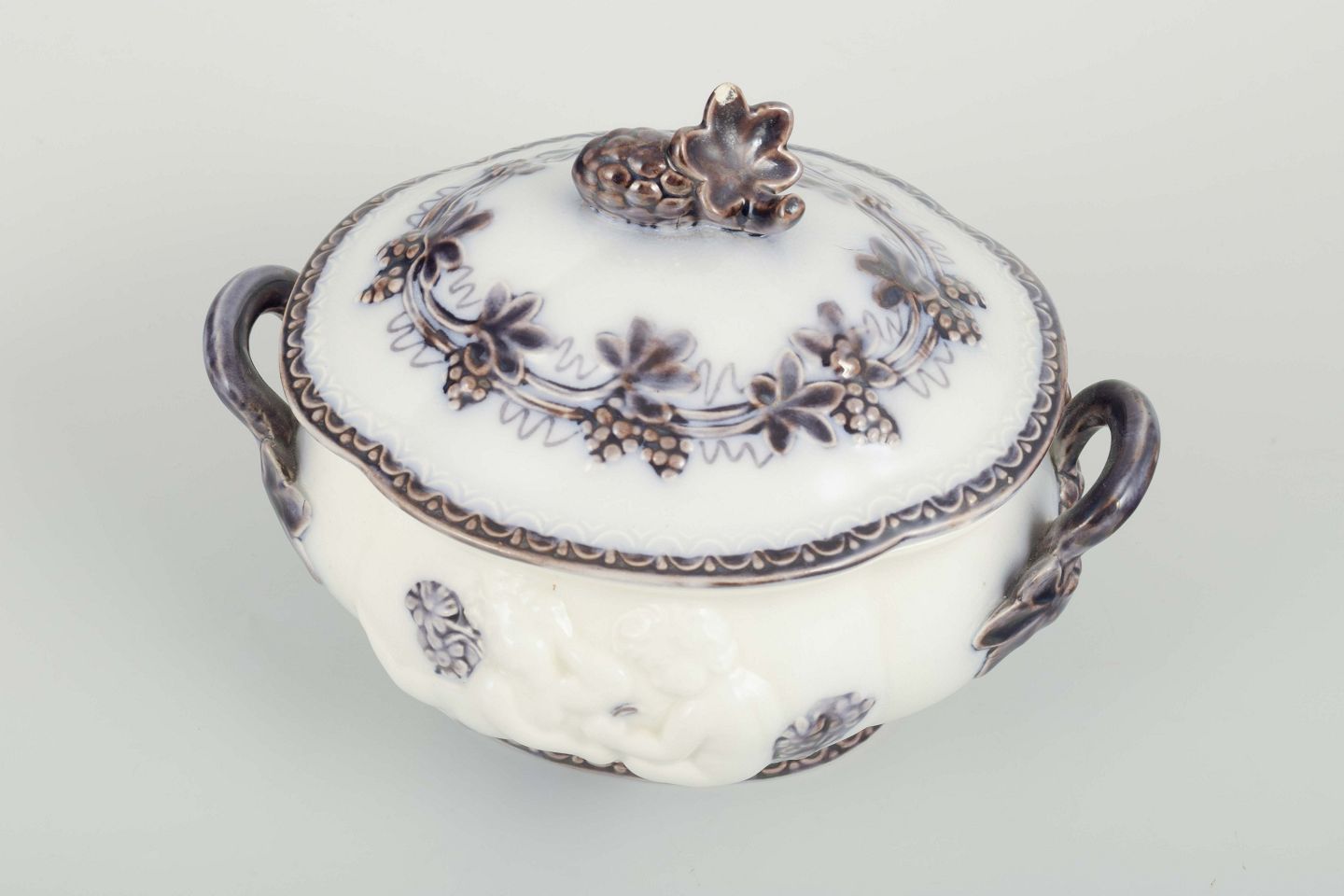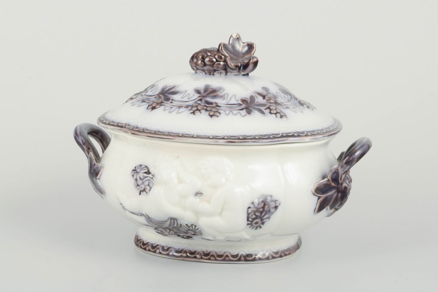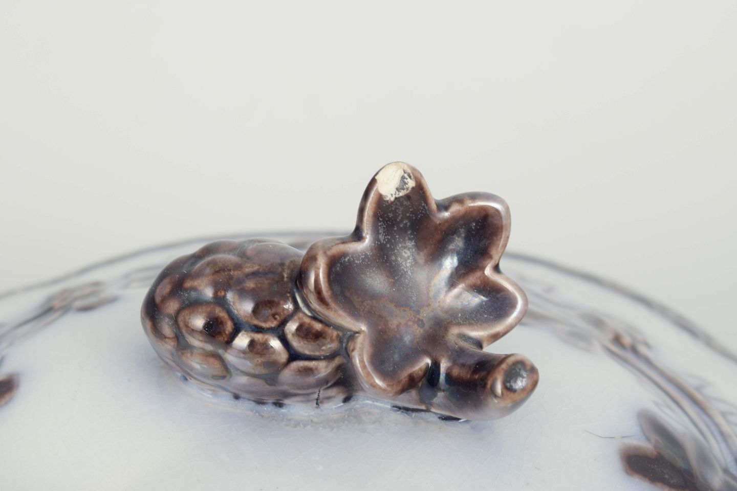 Oval faience tureen with lid, shaped with double handles and a knop modelled as a grape cluster with leaf. Decorated in relief and transfer print with vine motifs in brownish tones.