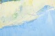 A modernist coastal landscape in light blue, green, and sandy tones, depicting the characteristic cliffs and sea of Gotland in a stylized, simplified visual language. The painting is marked by a textured brushstroke and clear geometric form, emphasizing the contrasts and calm of nature.