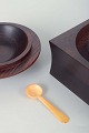 Elegant square box in exotic wood with domed lid and original horn spoon. Simple and functional design, characteristic of Danish design in the 1960s.