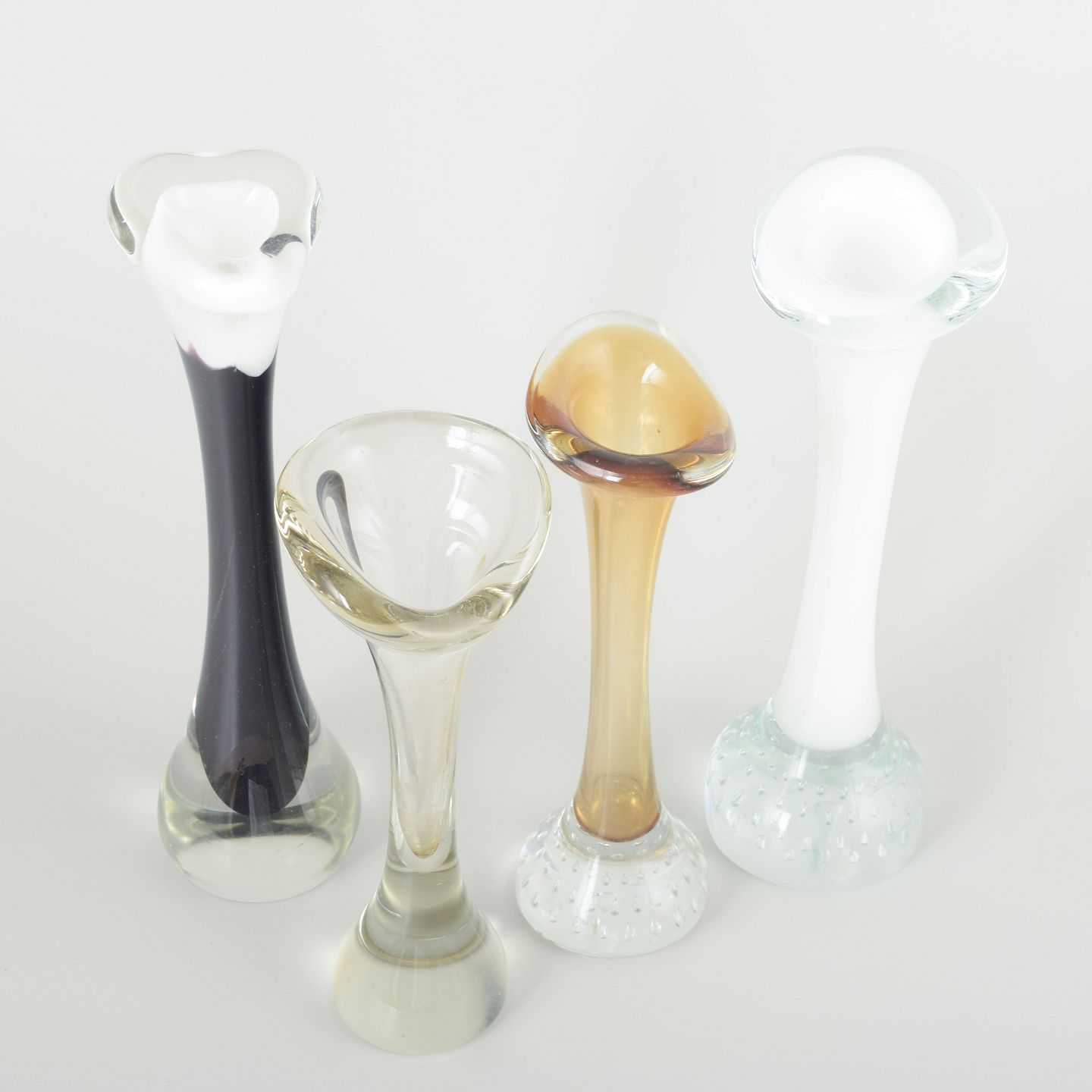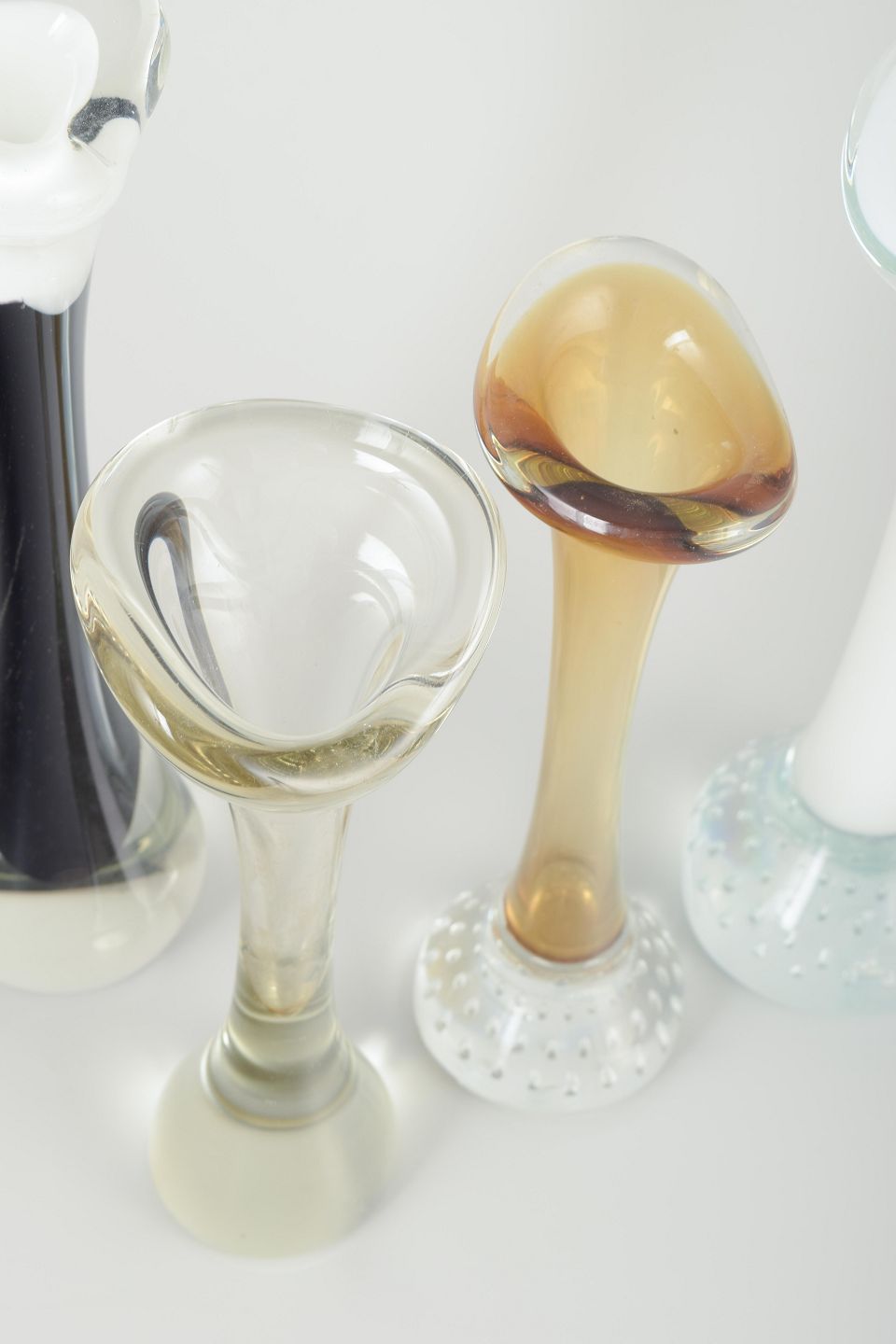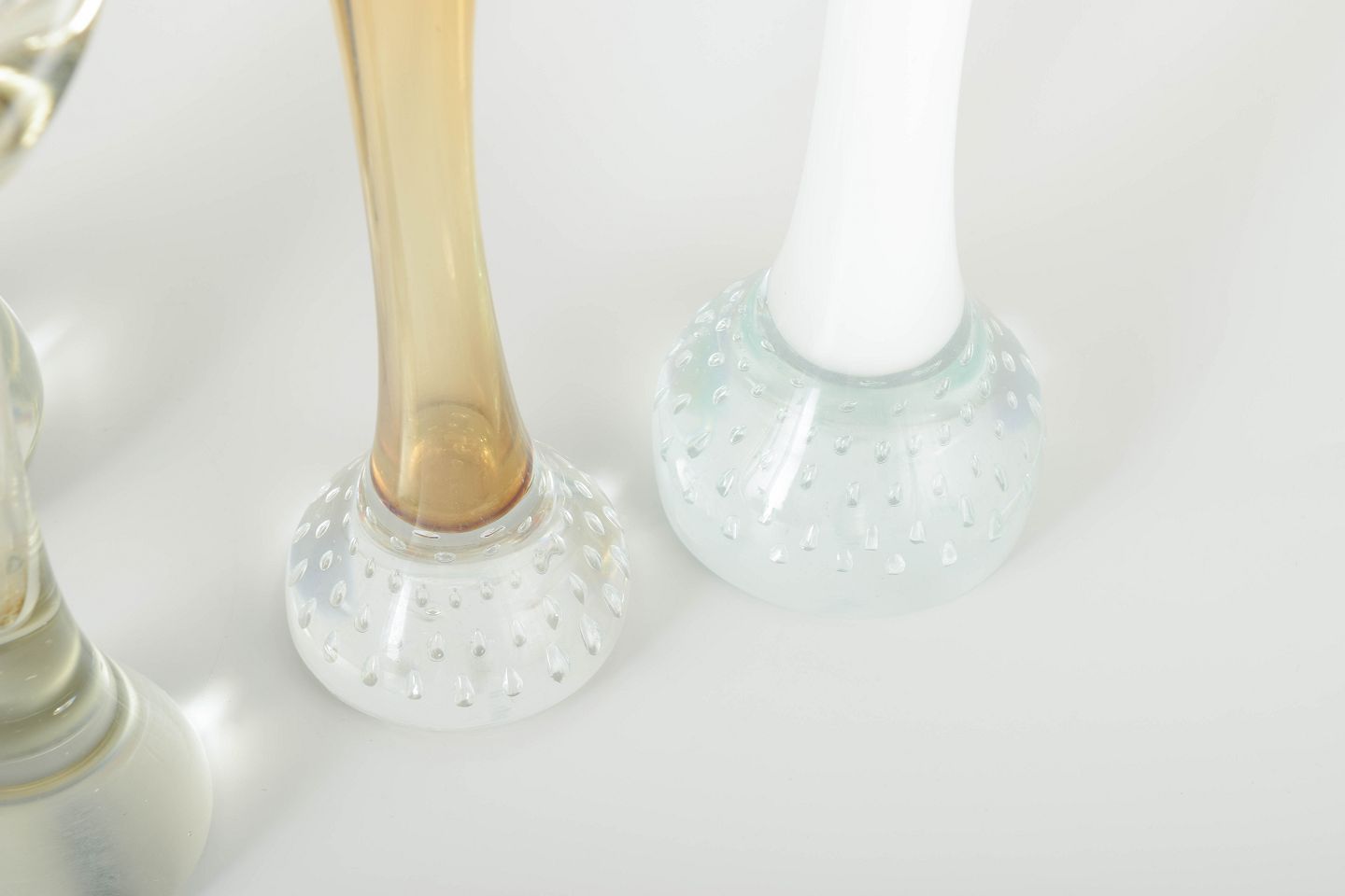 Series of mouth-blown glass vases in clear and opaline shades of white, amber, smoke, and black. Elegant organic form with wide, soft rim and rounded base. One vase signed at the bottom “Flygsfors 55”.