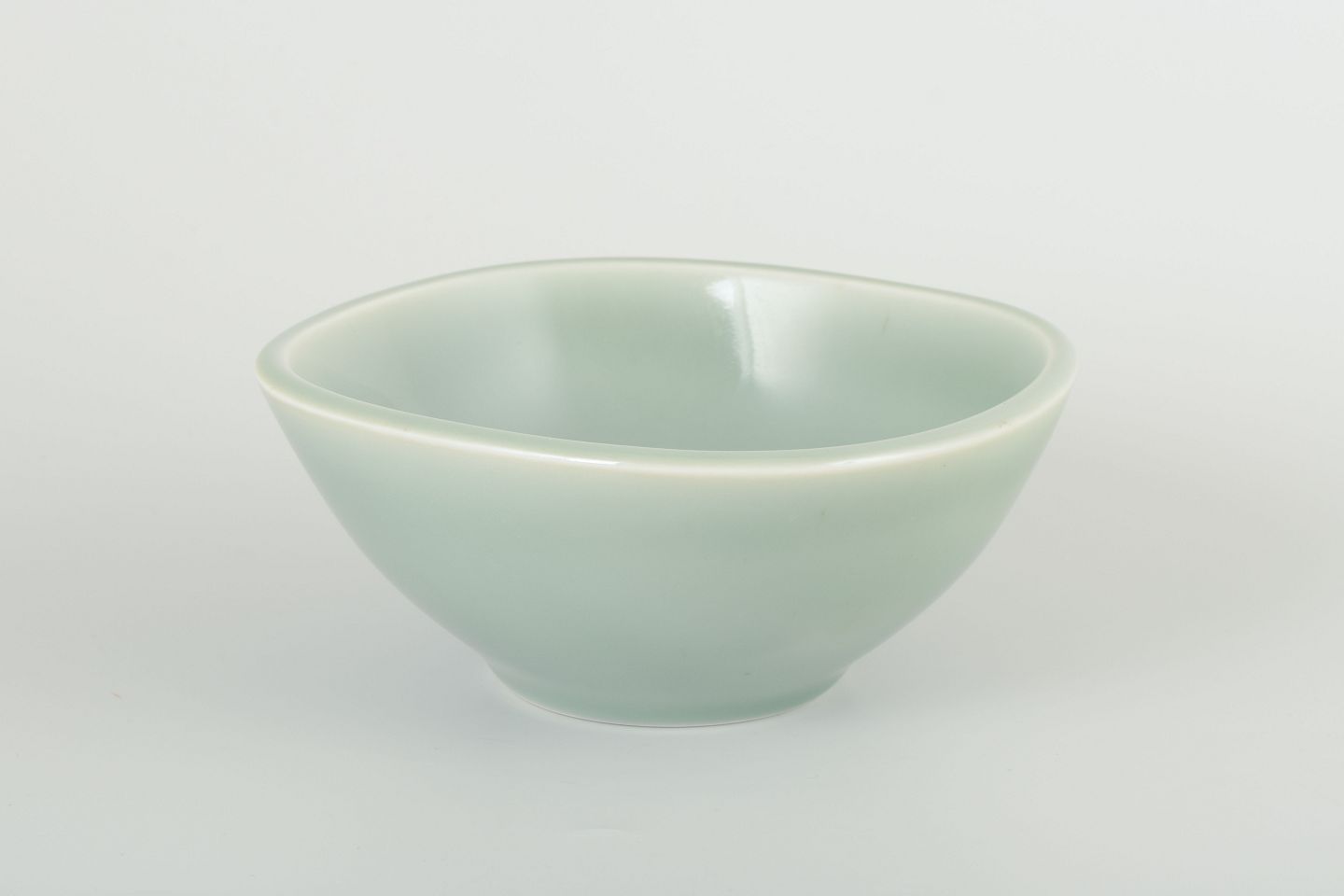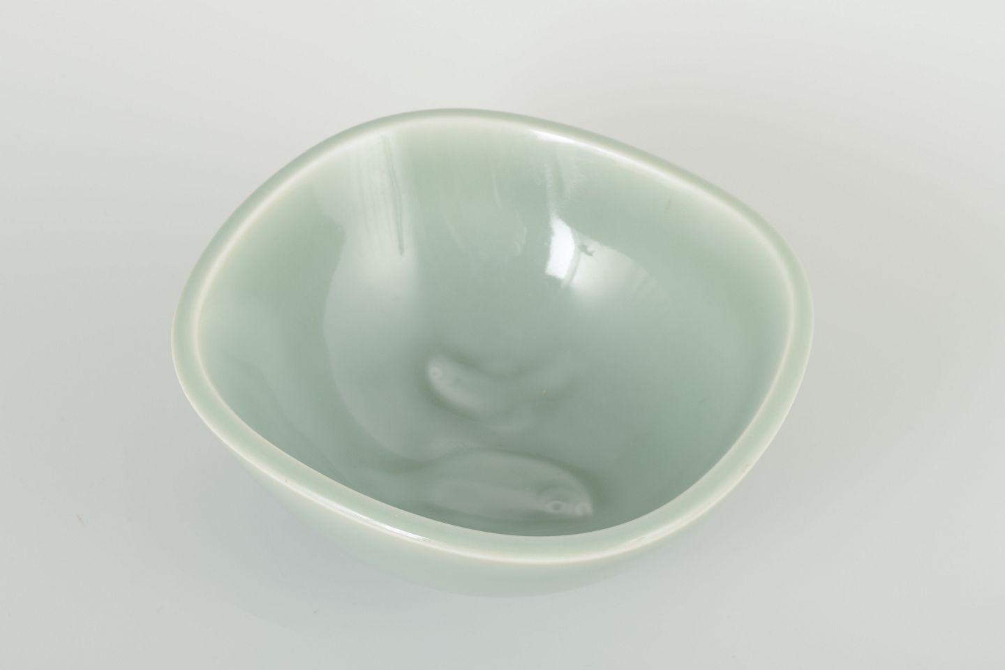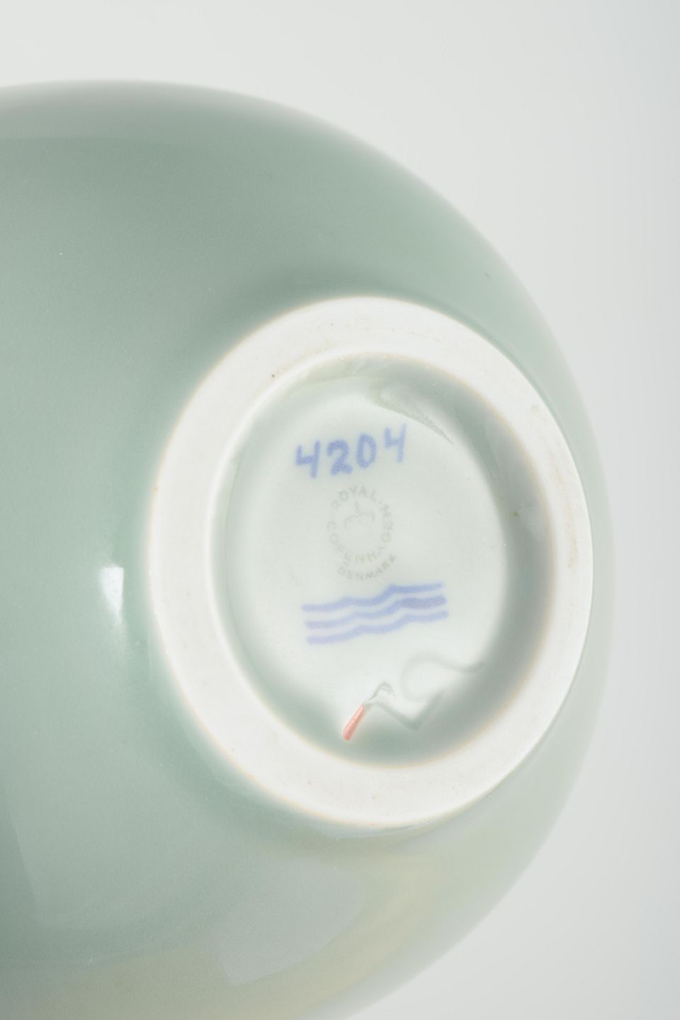Nils Thorsson (1898–1975) was one of Royal Copenhagen’s leading designers. His work ranged from detailed naturalistic decoration to minimalist modern forms. During the 1940s he explored refined glazes inspired by classical Asian ceramics, exemplified by the soft celadon tones seen here.