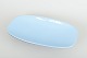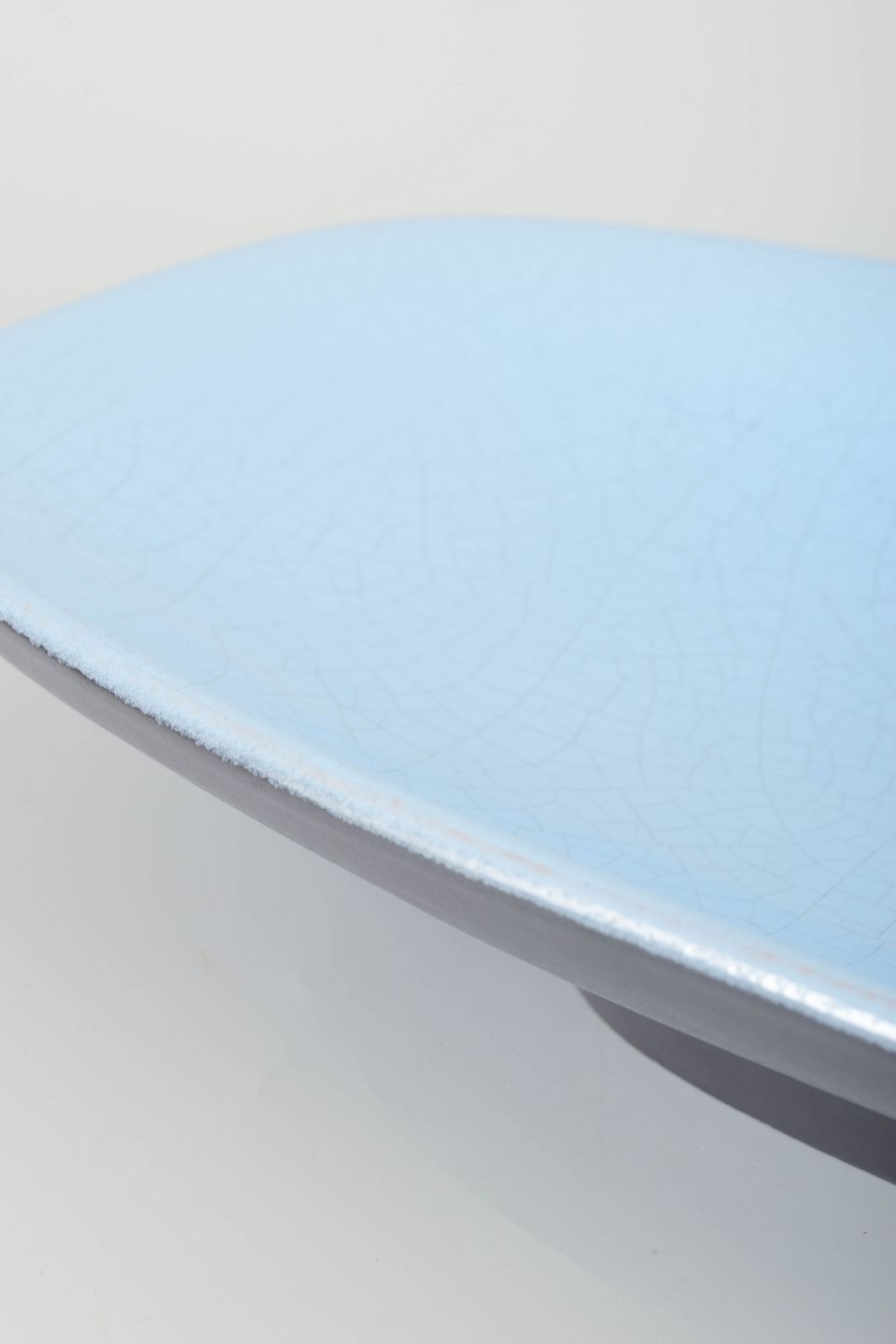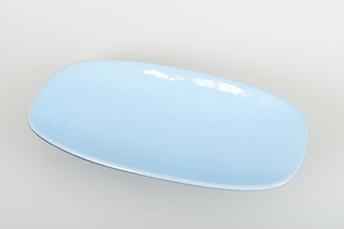 Elegant oblong dish in glazed ceramic with light blue crackle glaze and dark underside in a refined, minimalist mid-century form.