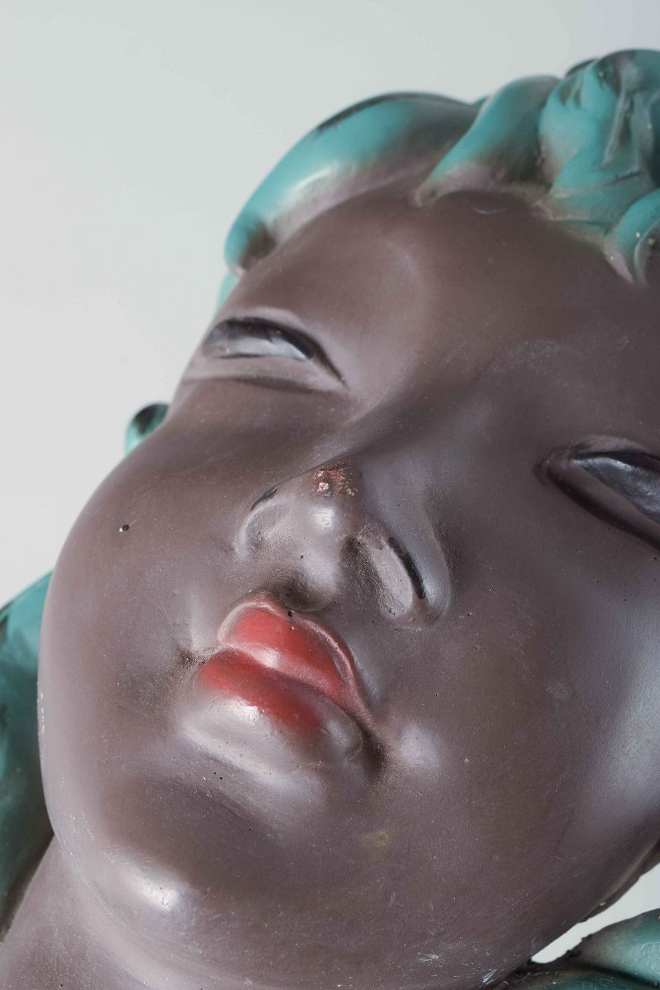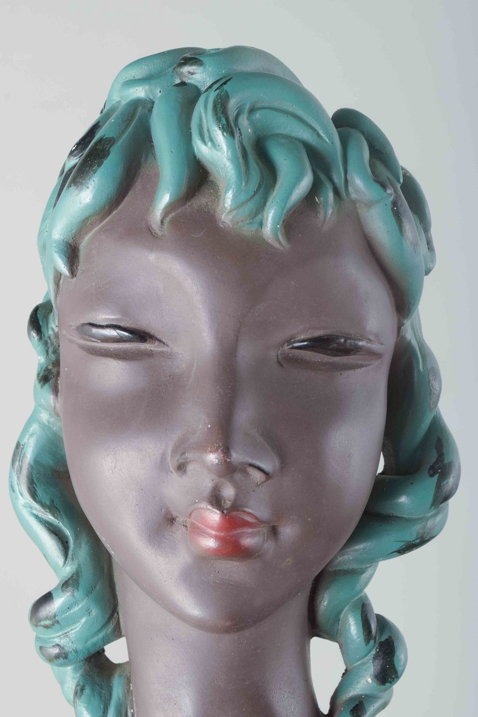 Decorative Italian ceramic bust of a woman’s head with turquoise and black hair tones and a reddish blouse. Executed in a stylized form typical of the period.