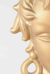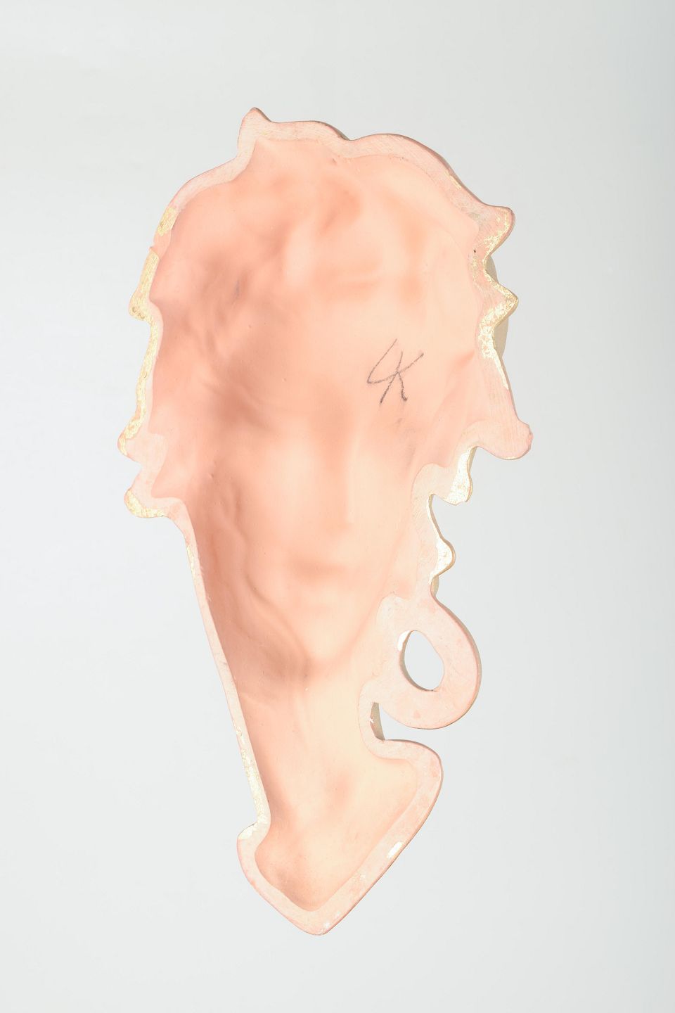 Decorative terracotta wall relief depicting a stylised woman’s head with large eyes, wavy hair and a loop earring. Finished in gold paint. Signed.
