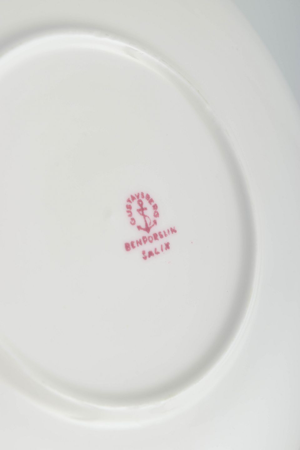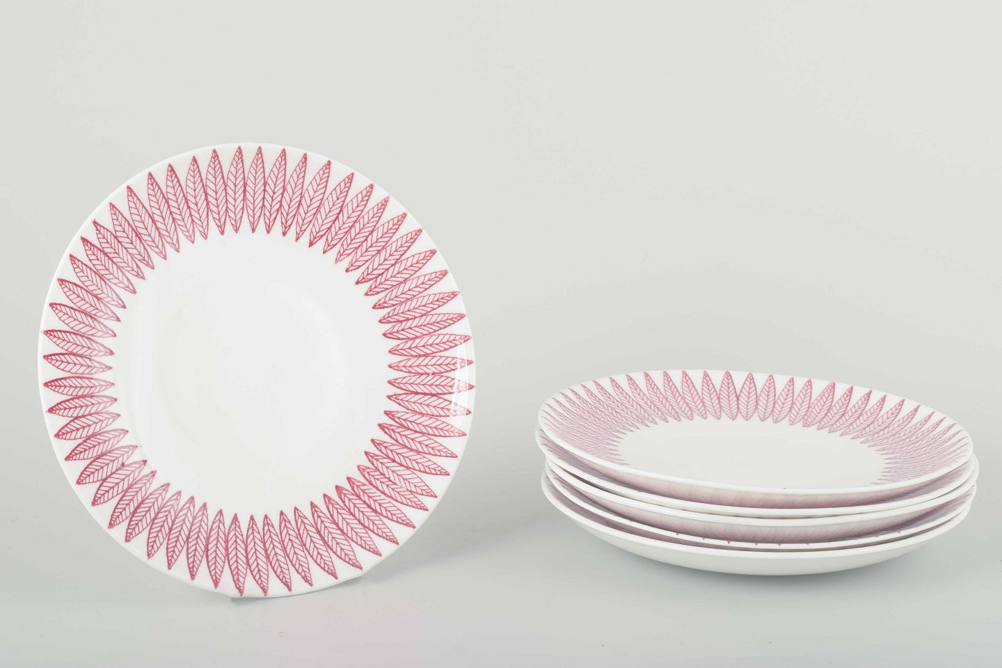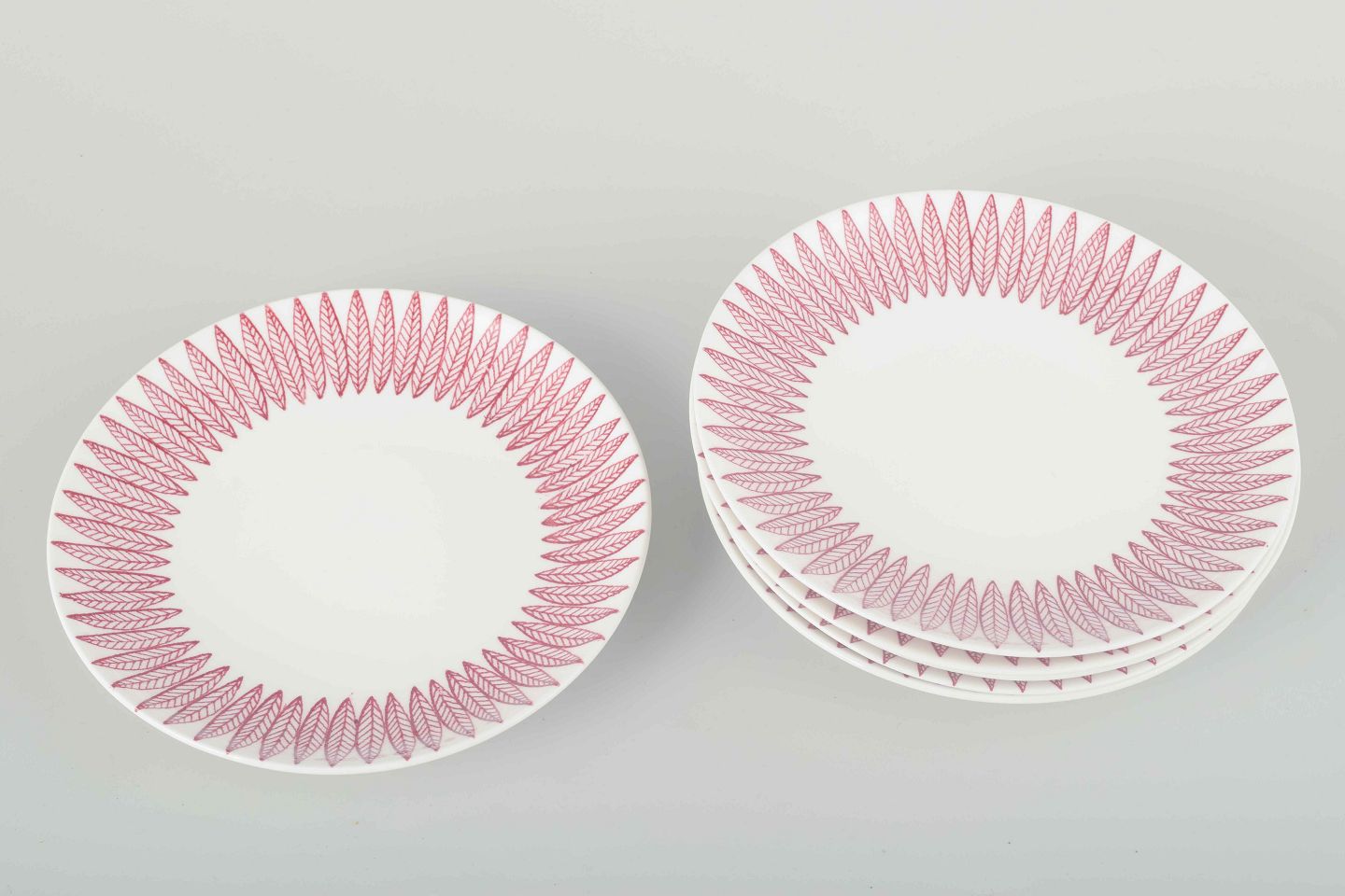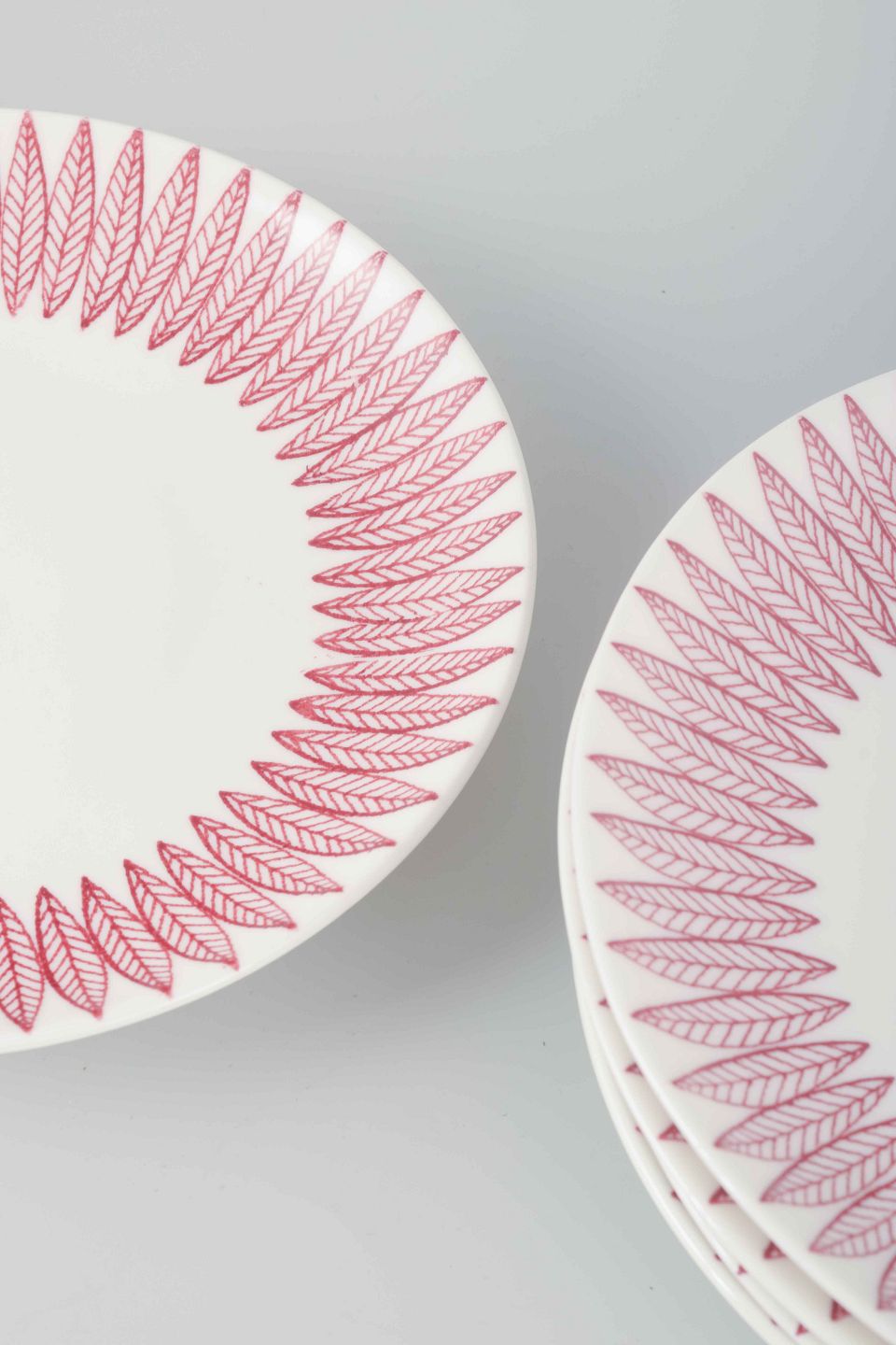 Set of six faience cake plates decorated with the characteristic red “Salix” pattern on white ground, designed by Stig Lindberg.