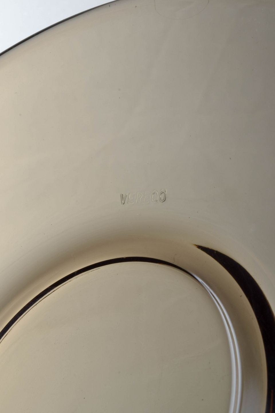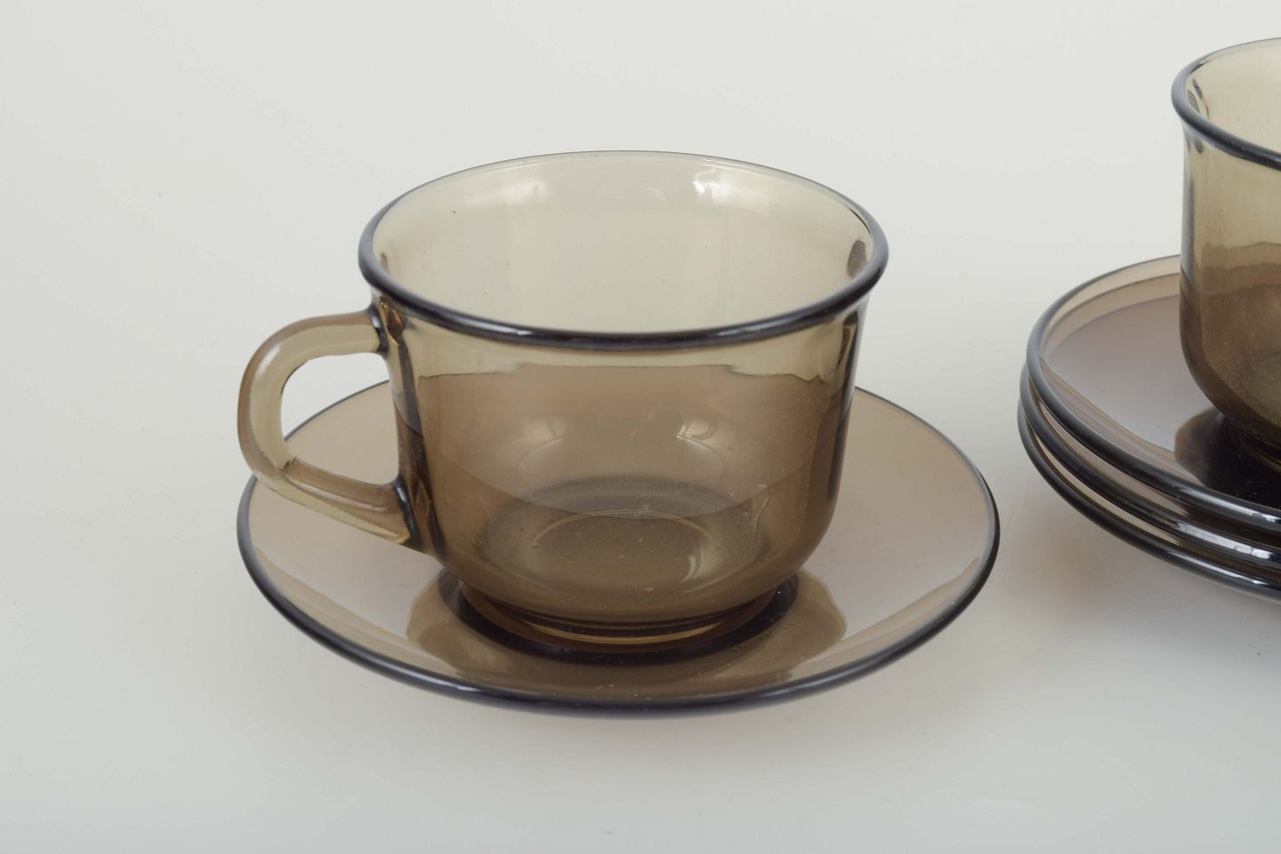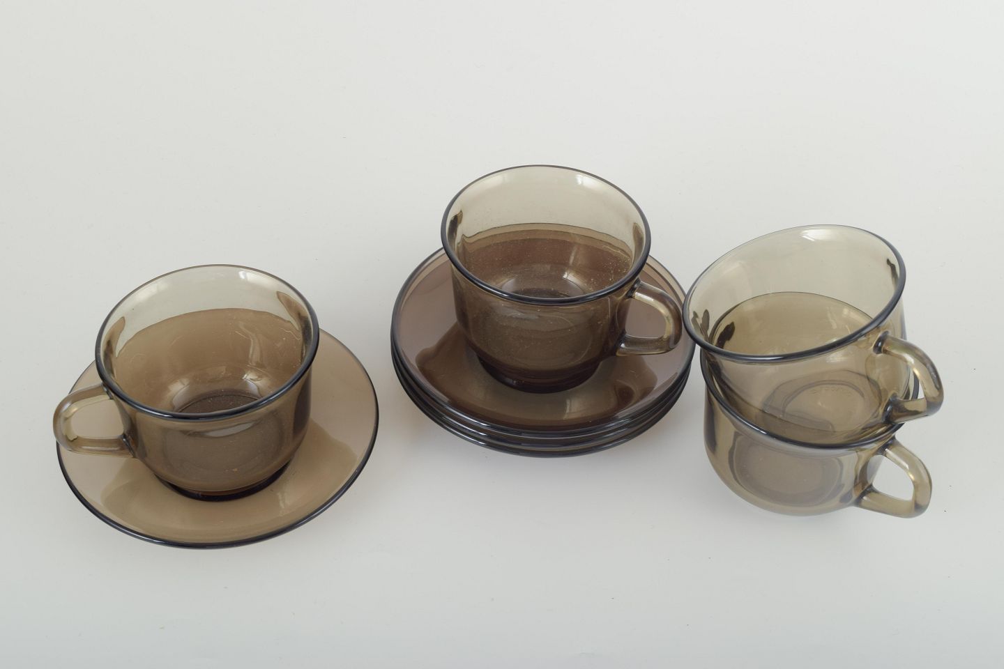 Set of four cups and four saucers in smoked glass. A classic French design by Vereco, known for its functional and timeless glassware with simple lines and warm tones.