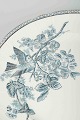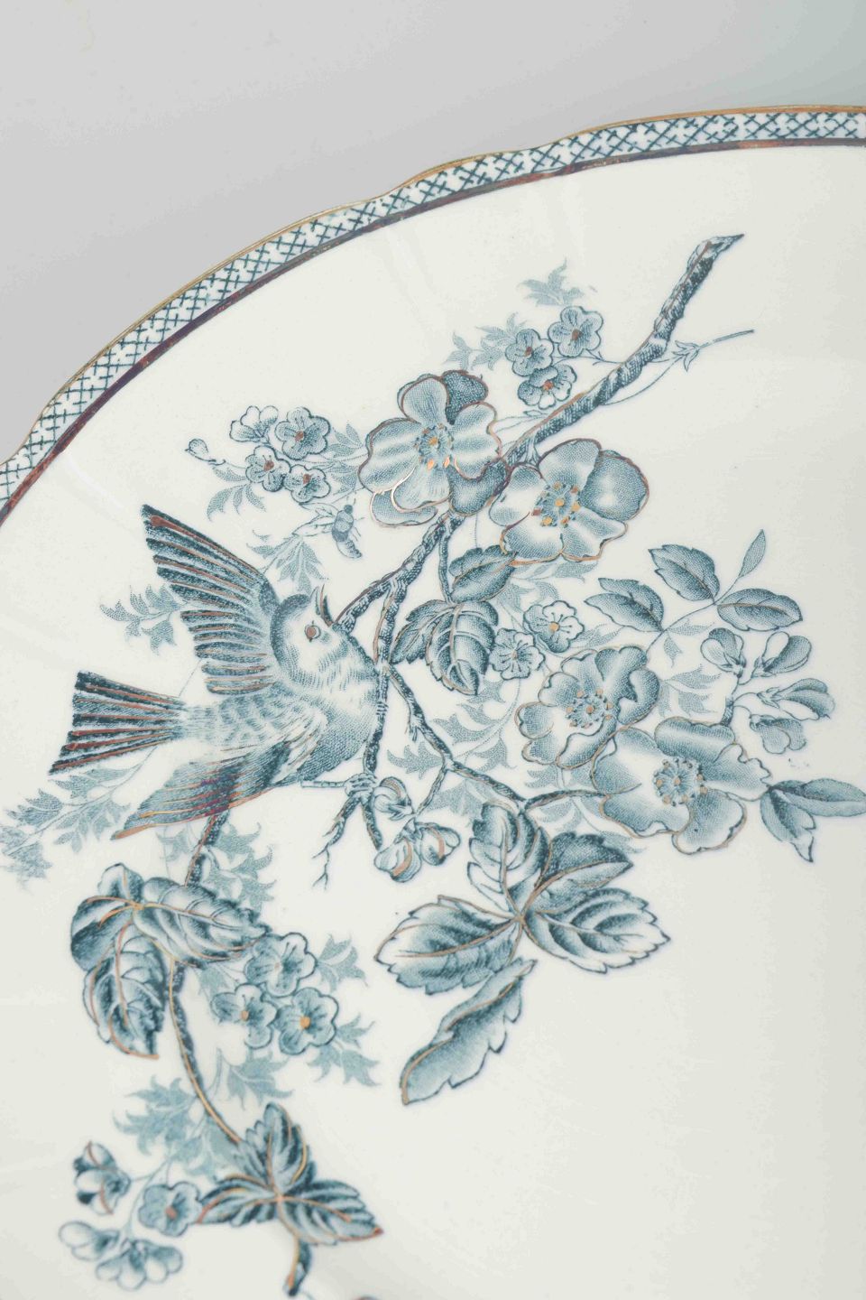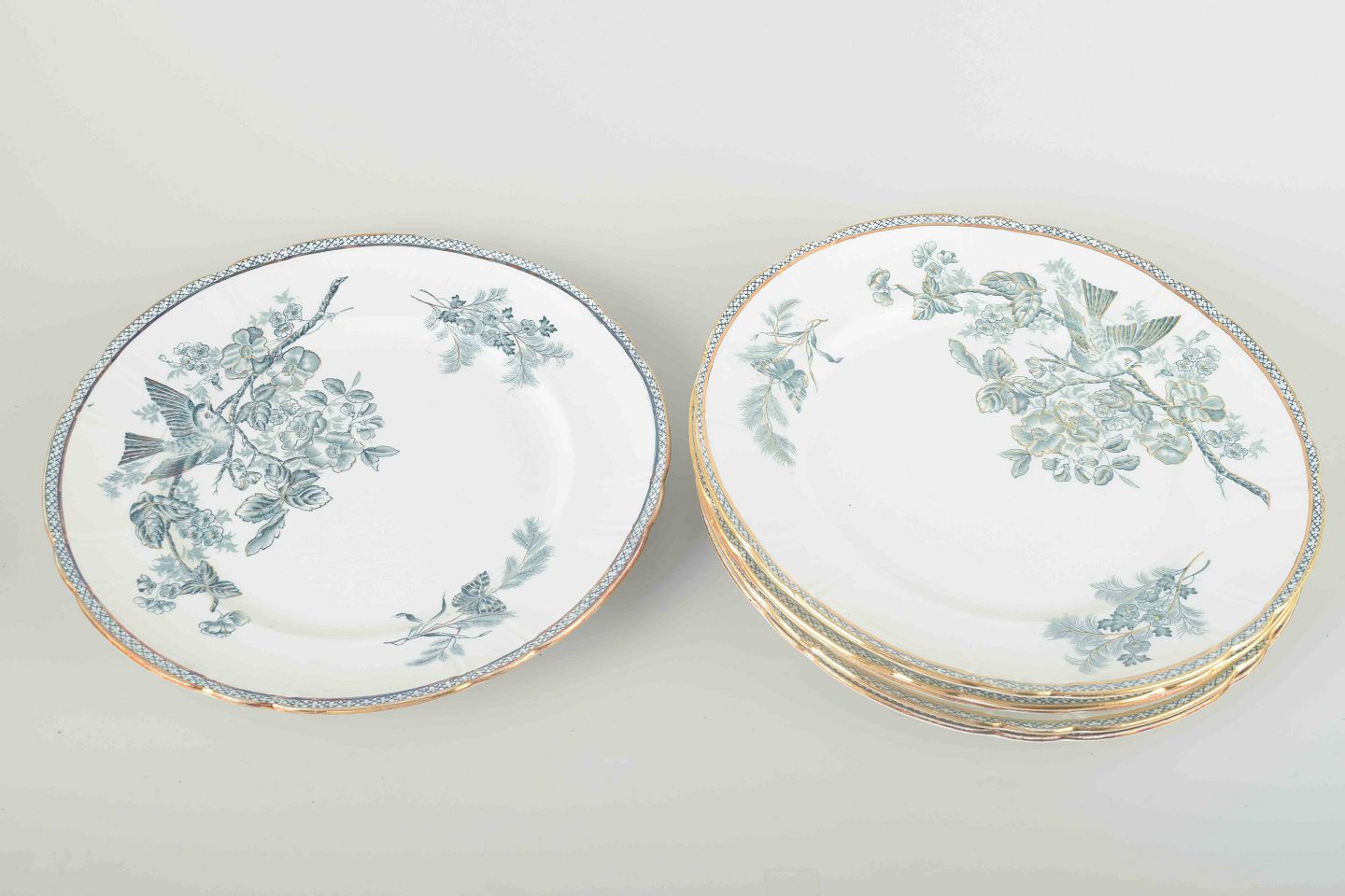 Six dinner plates in faience with printed decoration of a bird and flowering branch in bluish-green tones and a decorative border along the rim.
