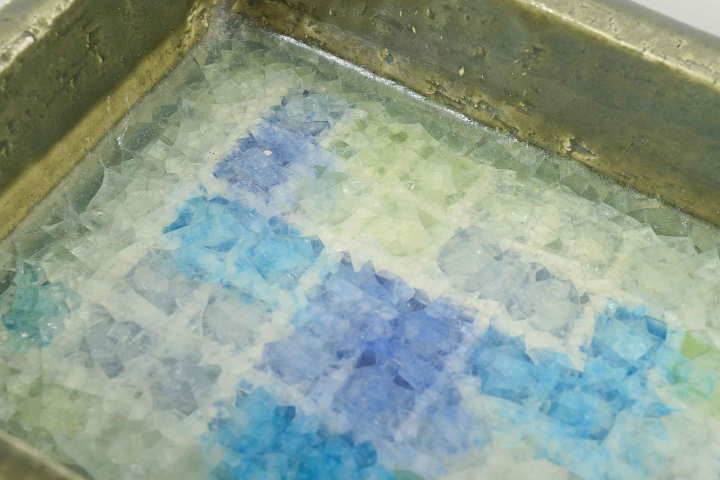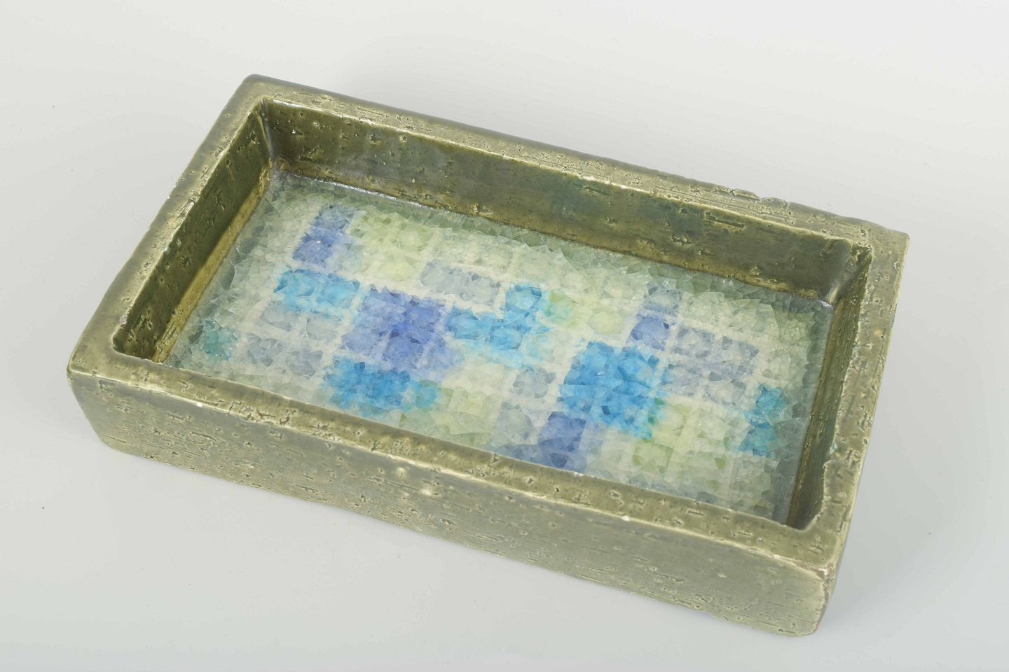 Large rectangular stoneware bowl with greenish glaze and interior mosaic decoration in blue and turquoise tones. A characteristic example of Bitossi art pottery from the 1970s, combining architectural form and vibrant glazing.