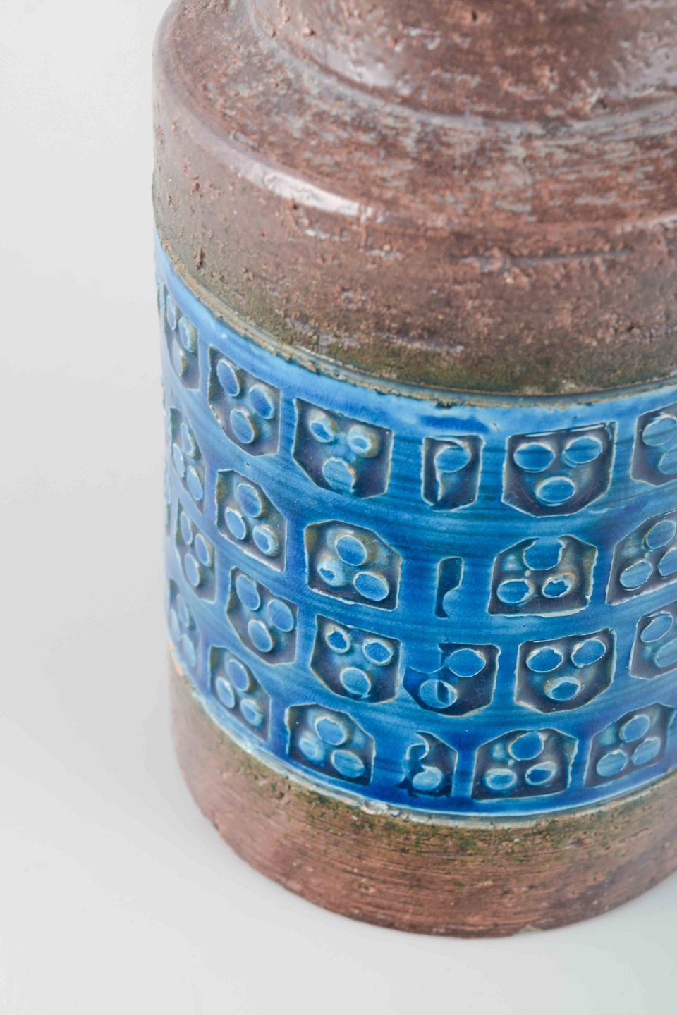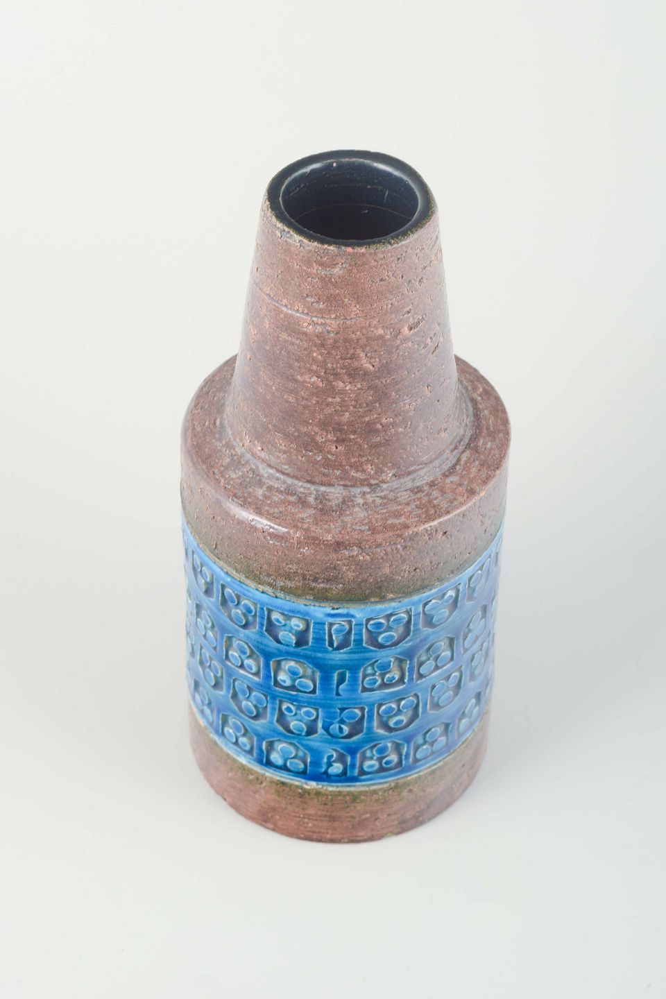Cylindrical stoneware vase with rustic brown glaze and a decorative band in the characteristic “Rimini Blu” glaze, featuring geometric relief patterns in shades of blue, turquoise, and green.