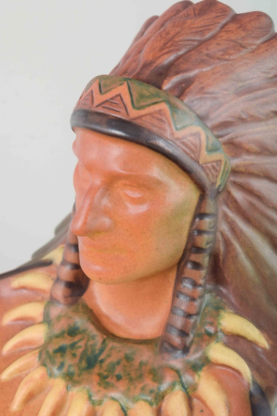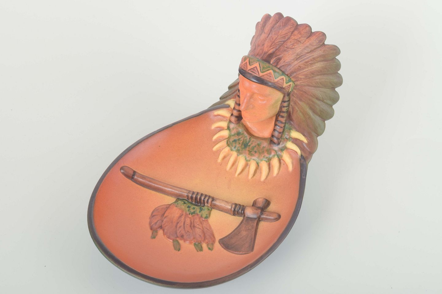 Decorative bowl featuring a relief bust of a Native American chief wearing a feathered headdress and claw necklace. Glazed in subdued shades of green, brown, and orange. A characteristic figurative work from Ipsens Enke, 1920s.