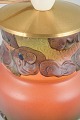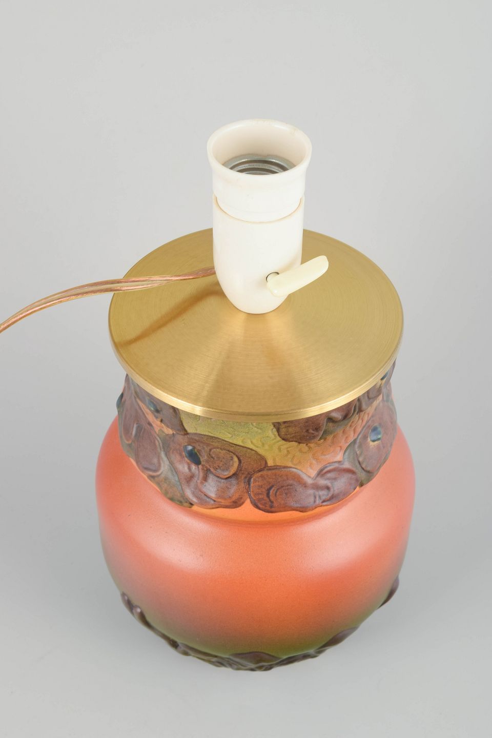Glazed ceramic lamp base with sculpted floral relief in brown and green tones over a matte orange glaze with green shading toward the base. Original metal top retained, later fitted with a modern electrical socket.