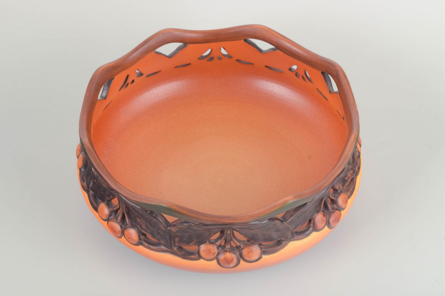 Art Deco / late Art Nouveau-inspired glazed ceramic bowl with openwork rim and sculpted relief of cherries and leaves in brown and green tones. Matte orange glaze with refined tonal shading toward the base.