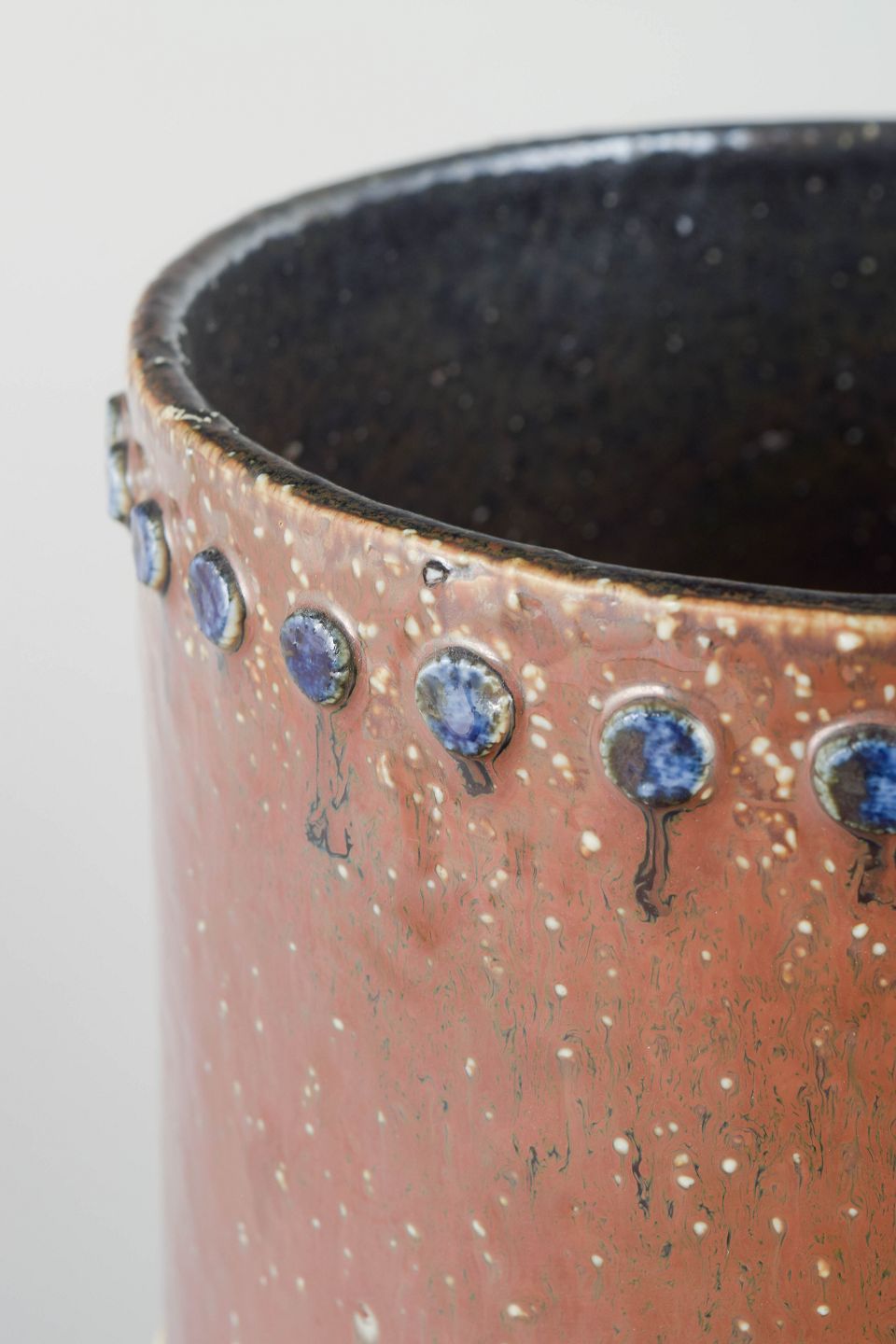 Cylindrical hand-thrown stoneware vase with warm reddish-brown glaze, dark interior glaze and decorative bands of applied blue and light ceramic studs in relief.