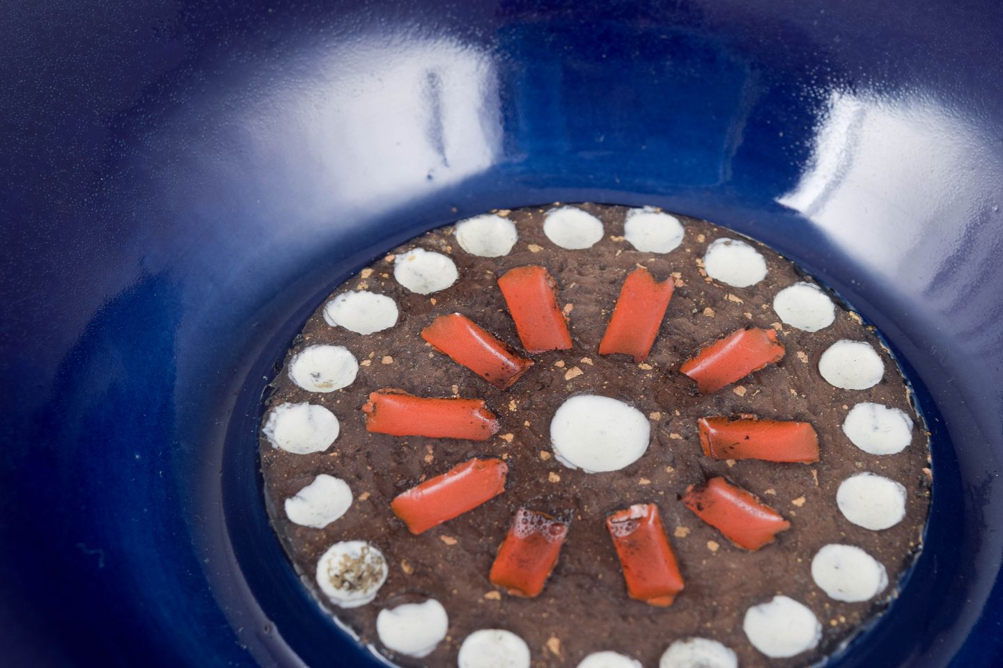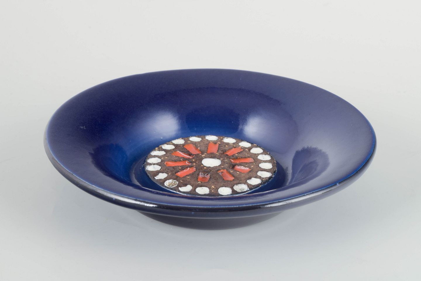 A refined and intensely cobalt-blue decorative dish, distinguished by an inlaid central relief composition that exemplifies Simmulson’s characteristic intersection of Scandinavian formal restraint and chromatically expressive ornamentality. The work reveals a compelling tactile interplay between the luminous glaze surface and the raw ceramic texture within the mosaic field.