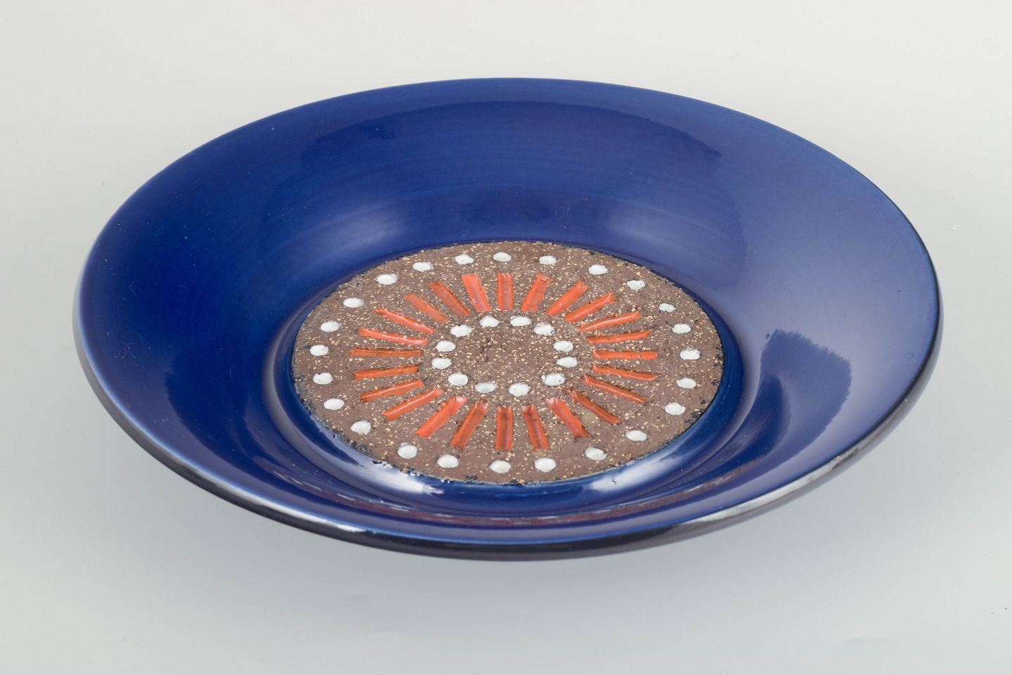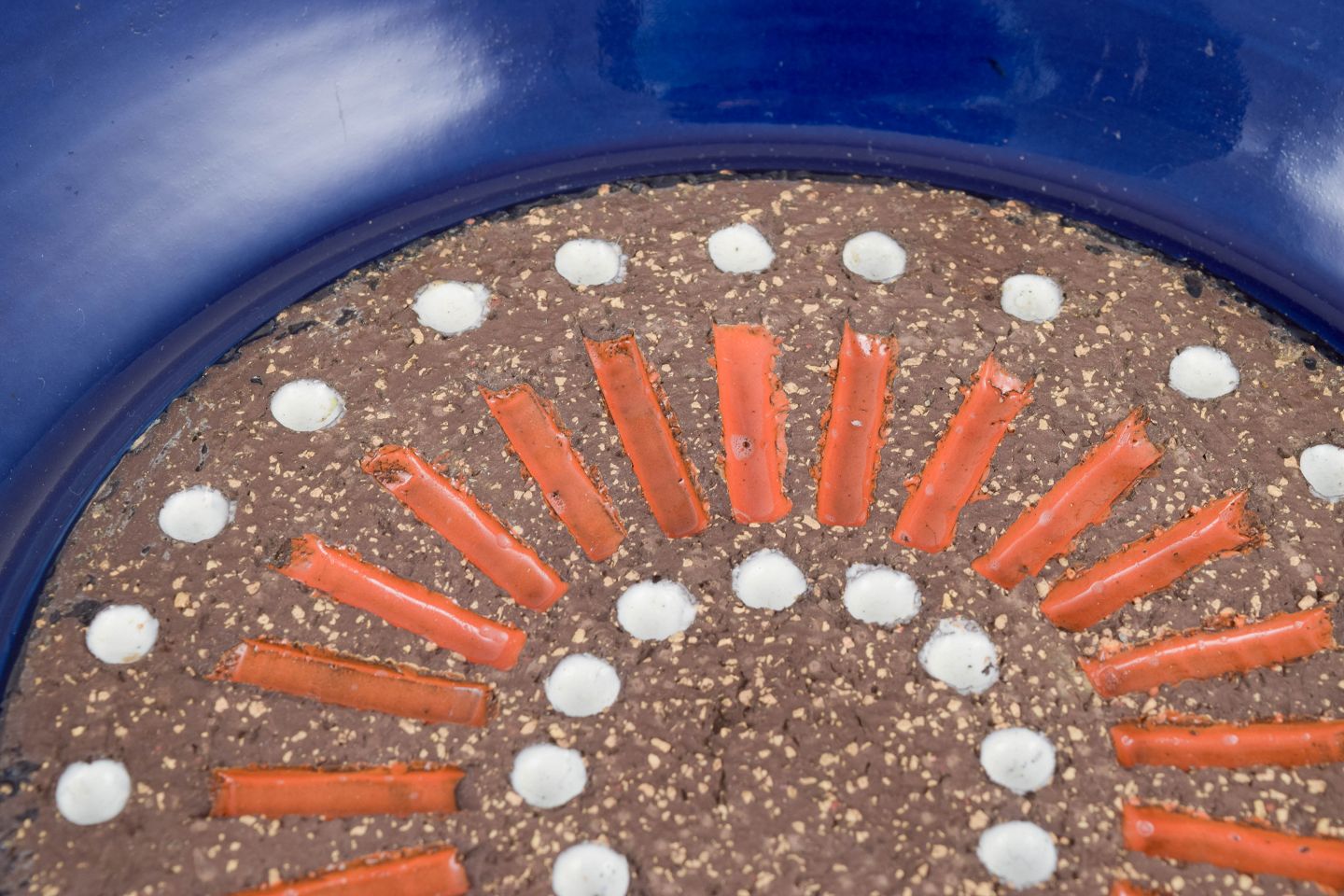 Hand-decorated ceramic dish featuring a dark, textured chamotte centre with radiating orange relief pattern and white dotted motifs — framed by a deep, glossy royal blue glaze.