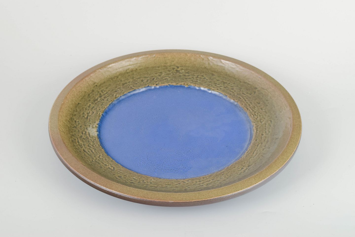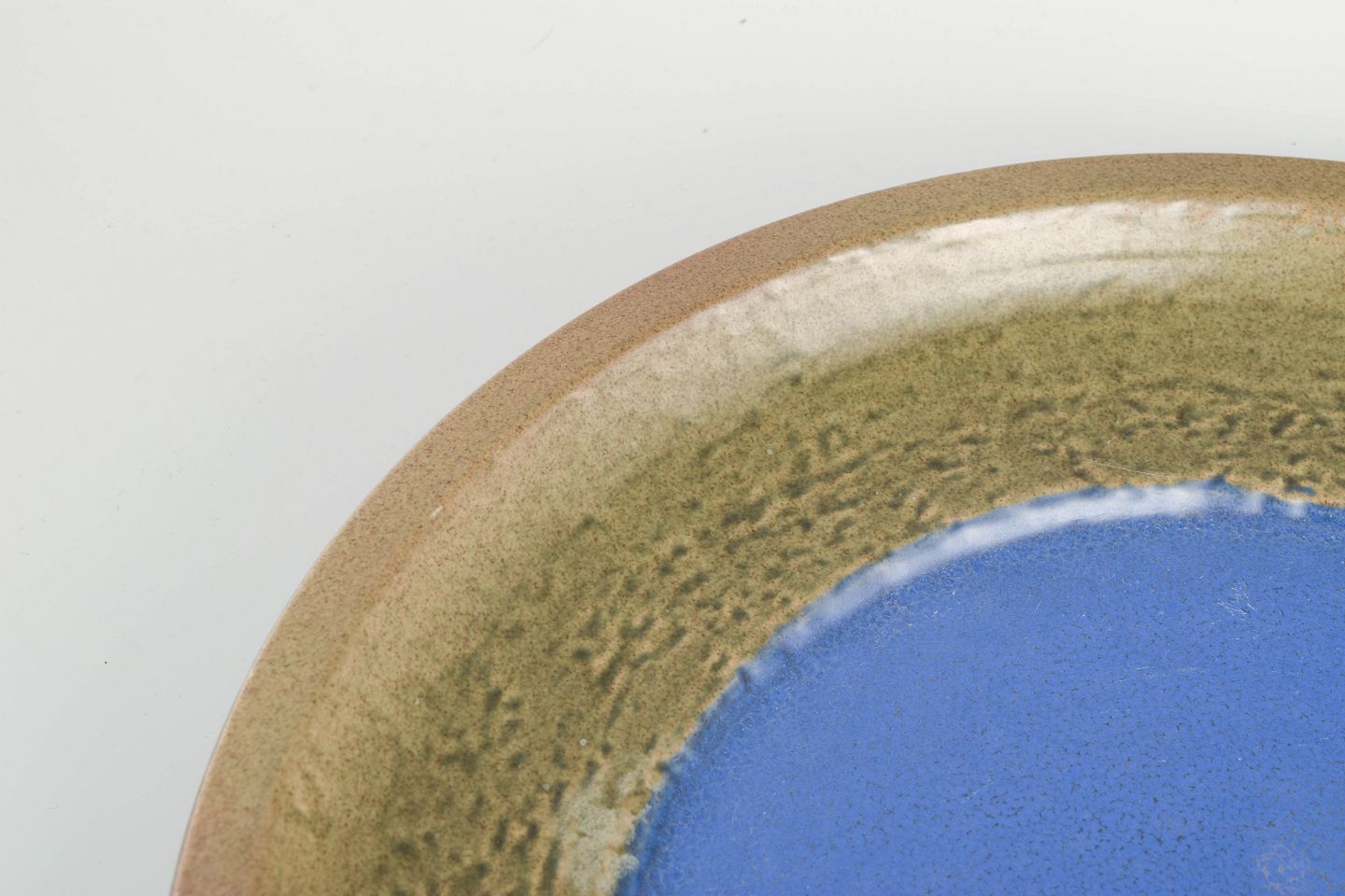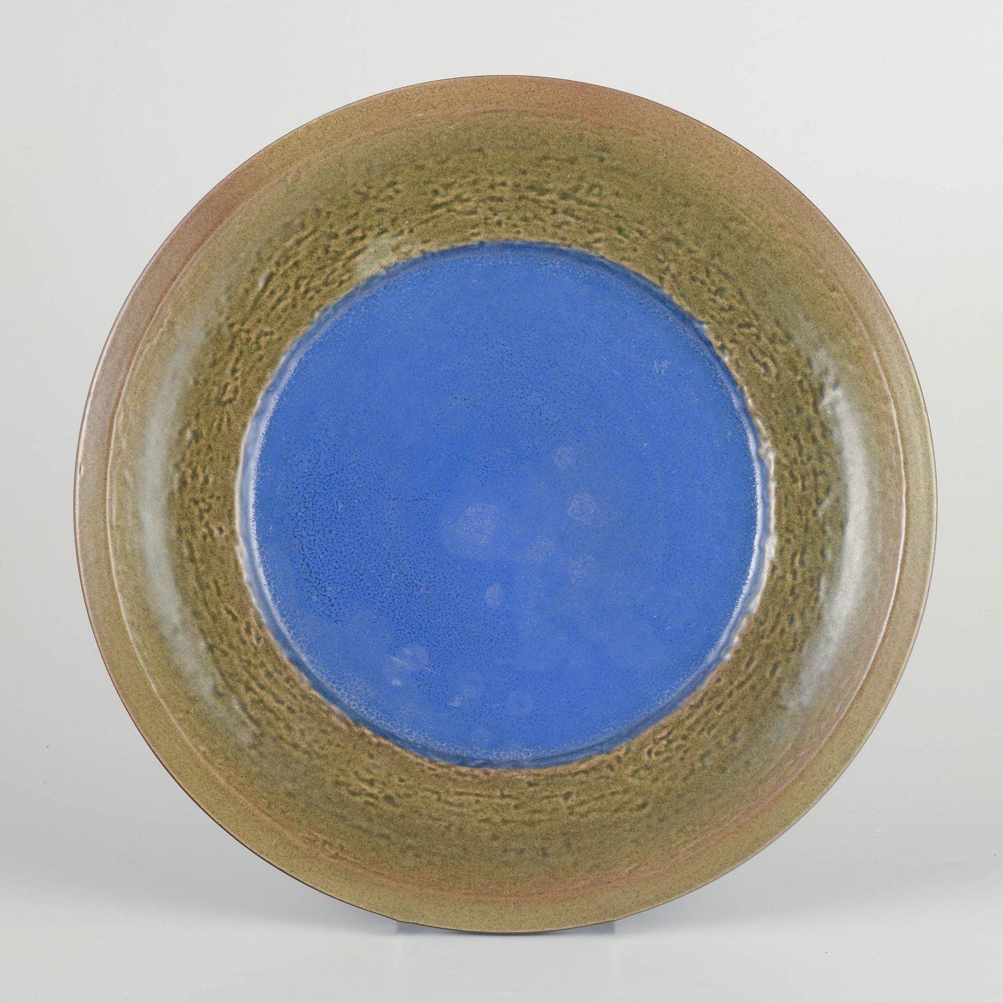Decorative serving or wall platter in glazed stoneware with a deep sapphire-blue centre and an earthy, subtly textured rim in matte olive tones — a characteristic example of Upsala Ekeby’s modern Scandinavian aesthetic.