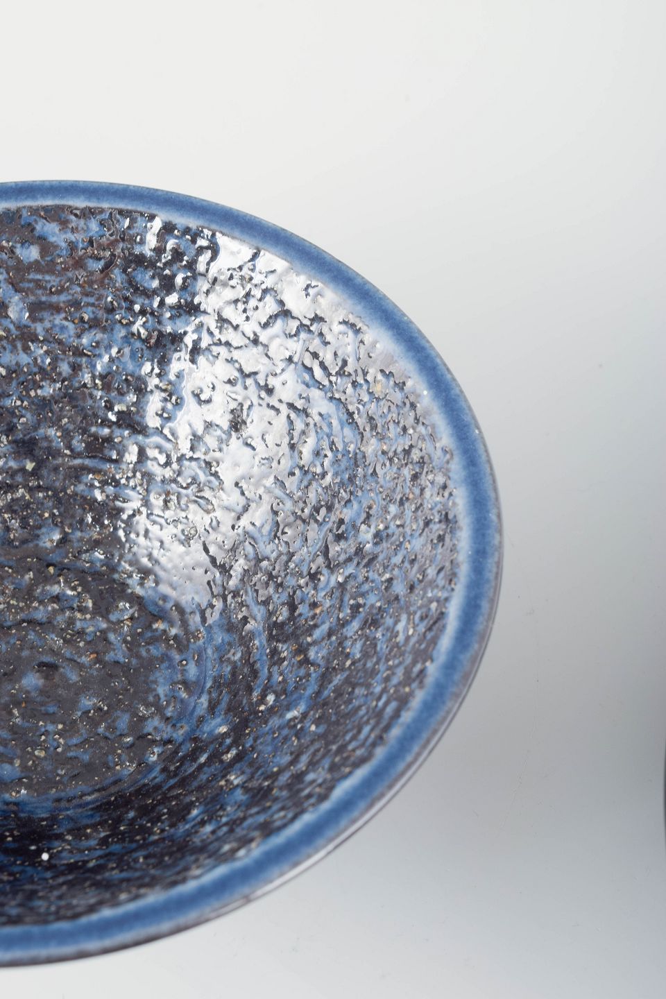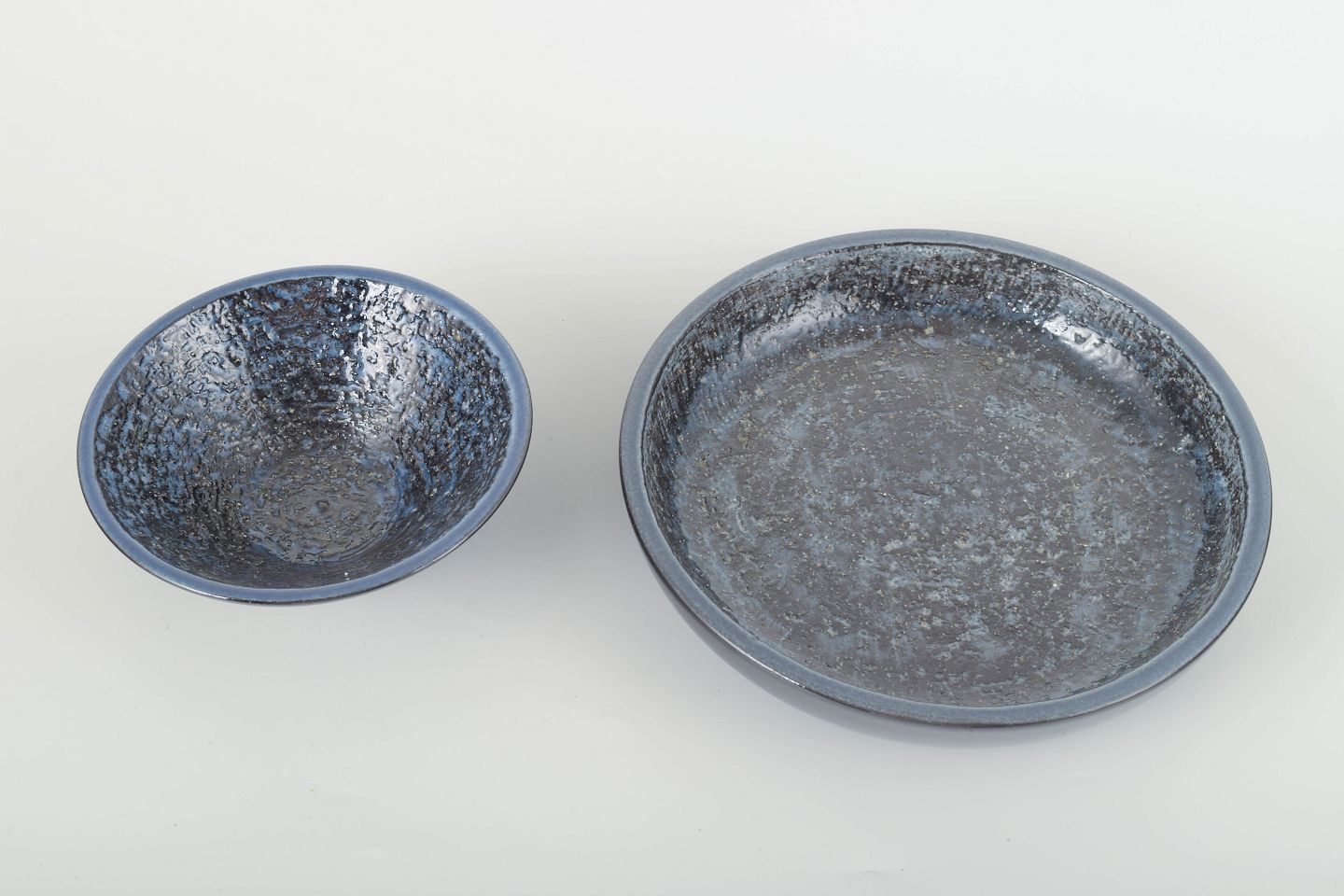 Two conical stoneware bowls with deep dark blue glaze featuring a subtle crystalline surface texture.