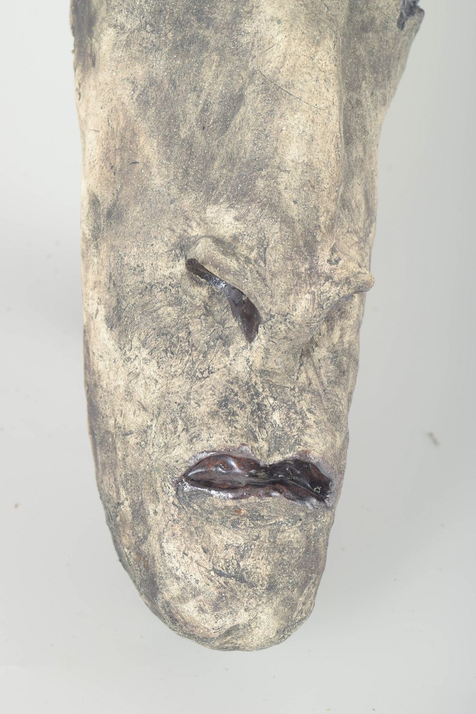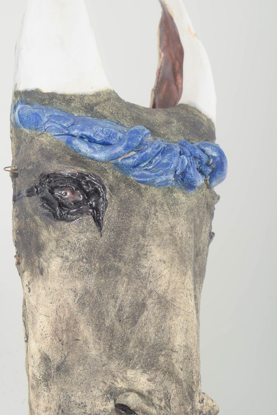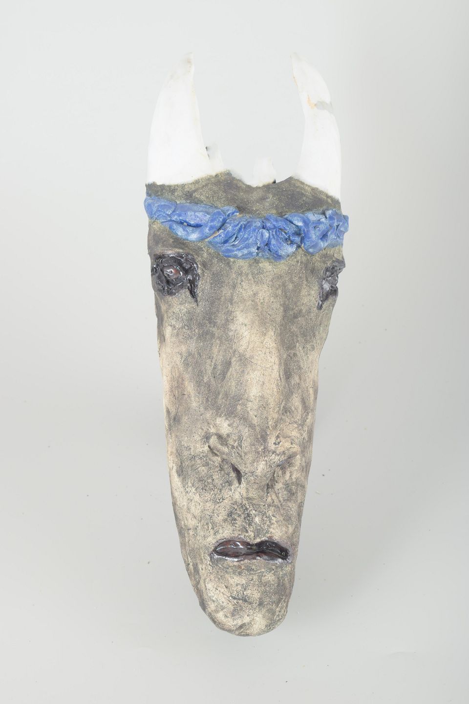 Unique hand-modelled stoneware sculpture with raw grey surface, decorated with a blue glazed band and white horn-like forms. An expressive, figurative work with strong artistic character.