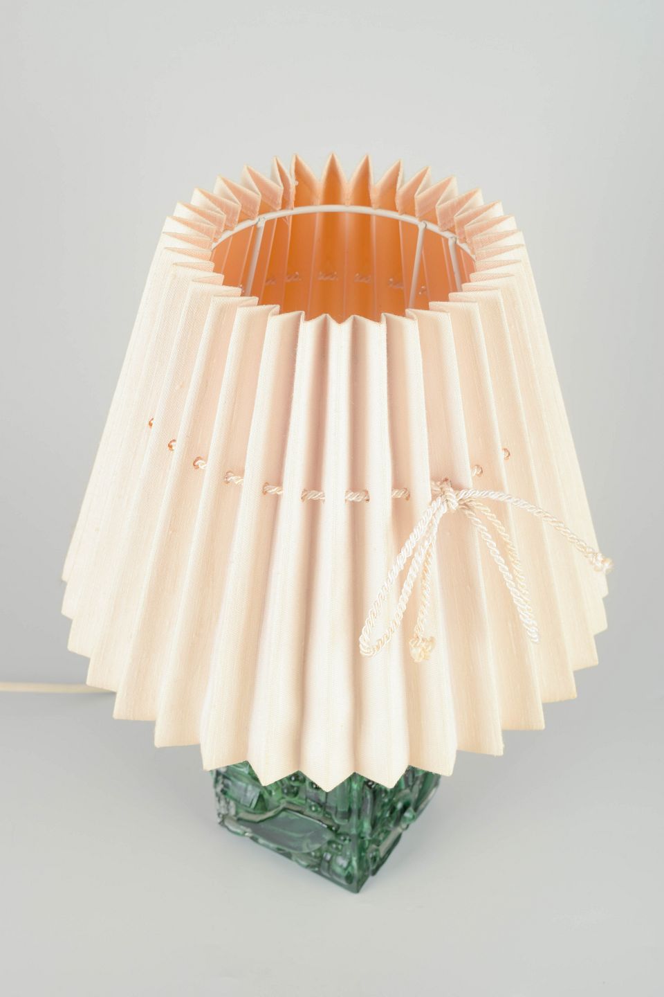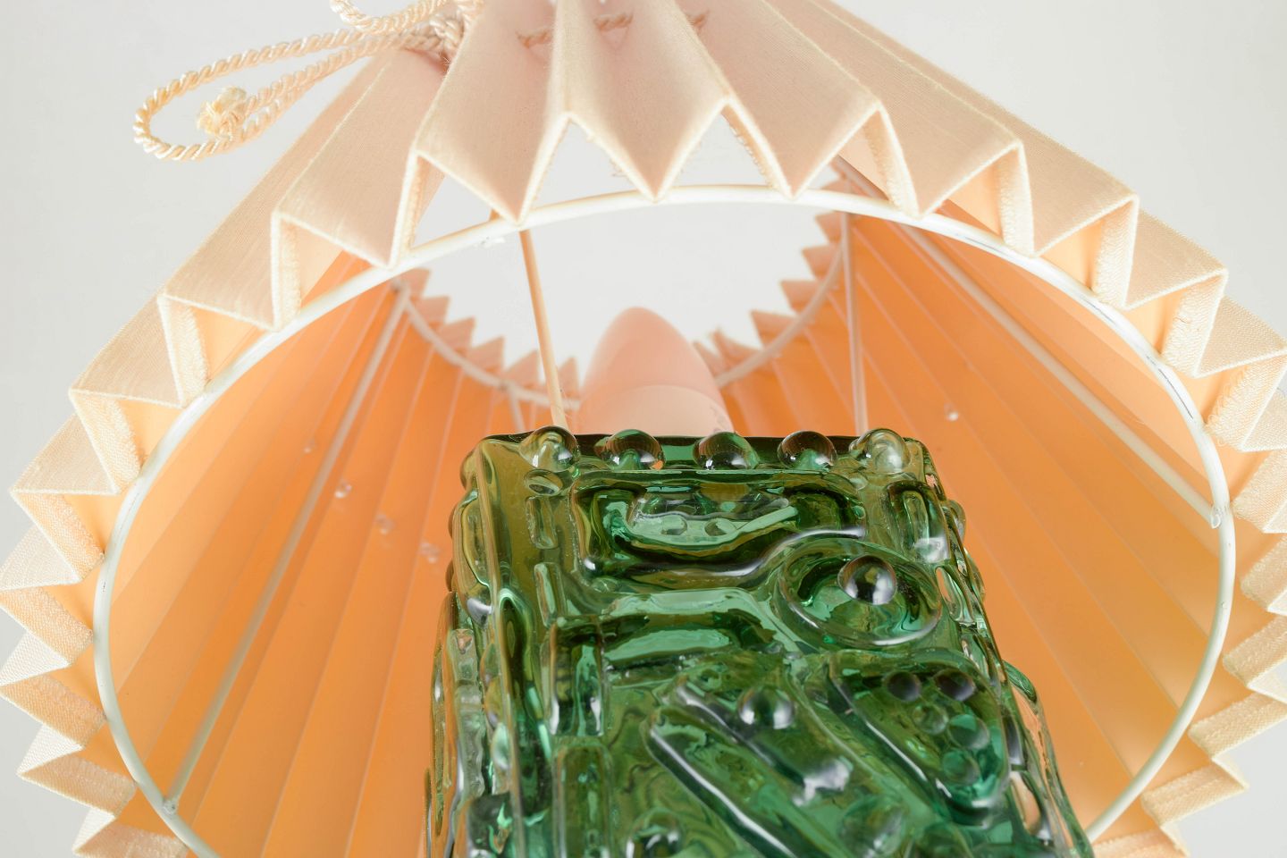 Rectangular lamp base in heavy pressed green art glass with abstract relief patterns and optical texture. Fitted with a pleated fabric lampshade.