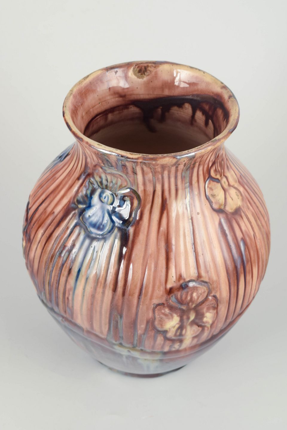 Hand-thrown and richly modelled stoneware vase with vertical ribbing and hand-sculpted floral reliefs. Flambé-style glaze in warm brown tones with flowing blue/violet accents — characteristic of Danish Jugend and early interwar studio craftsmanship.