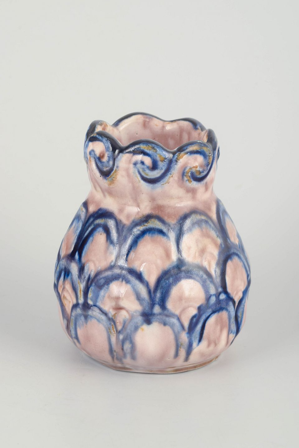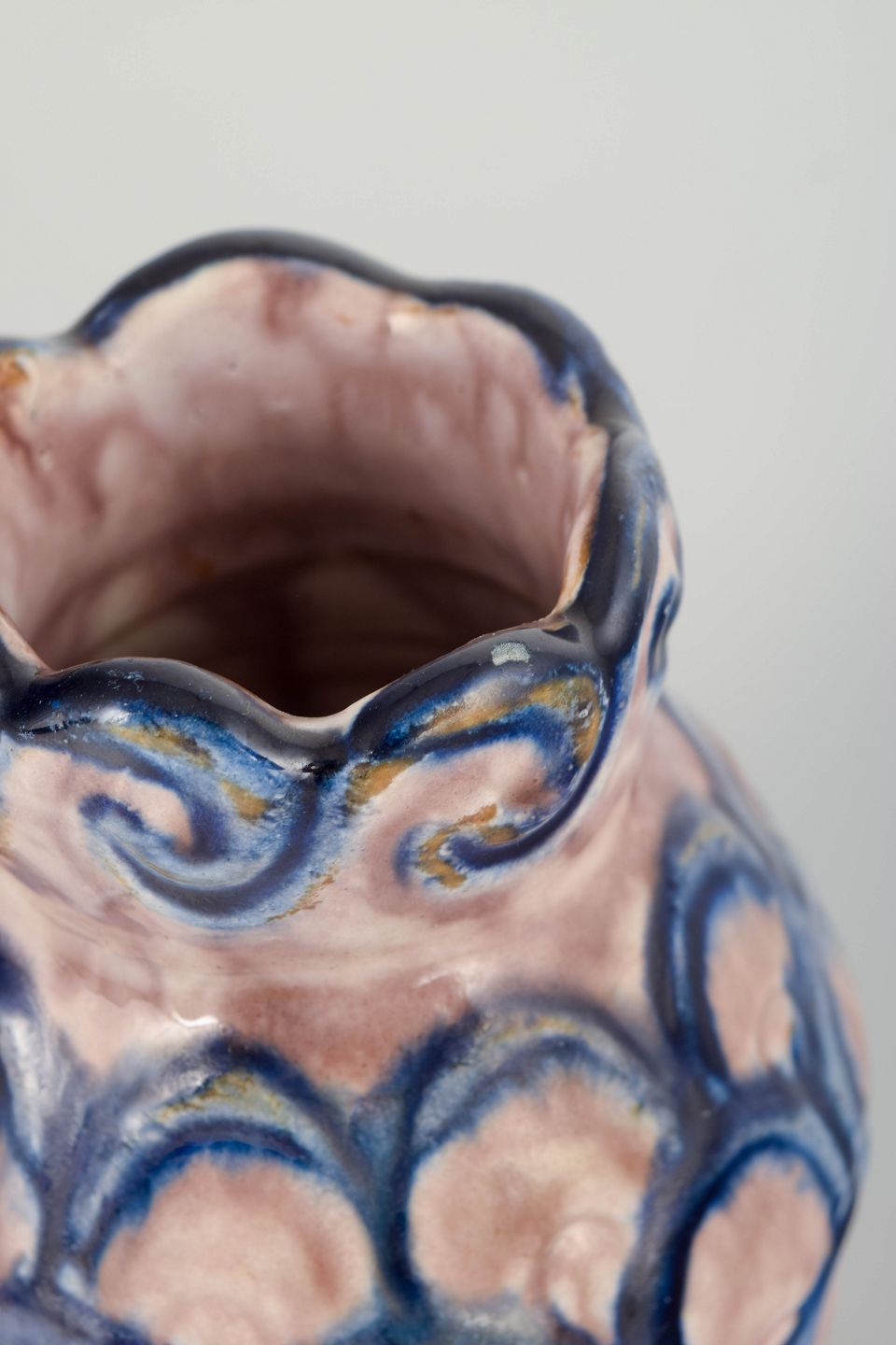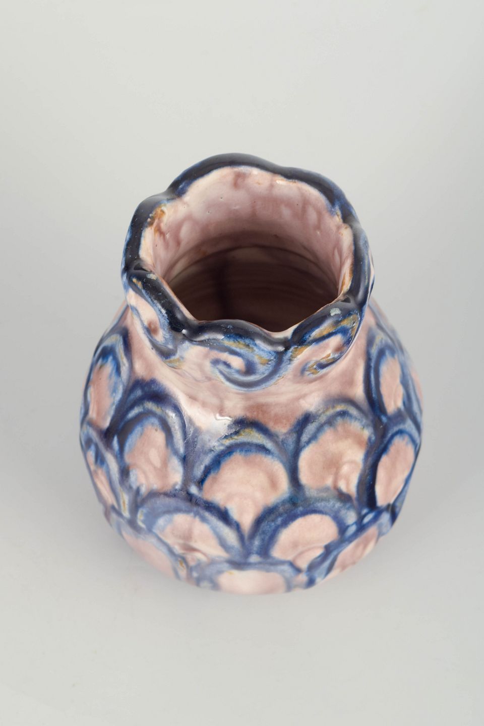 Hand-thrown stoneware vase with scalloped rim and organic Art Nouveau decoration in soft blush glaze with deep blue hand-painted arch motifs throughout. A unique artisan-made example from early Danish ceramic production.