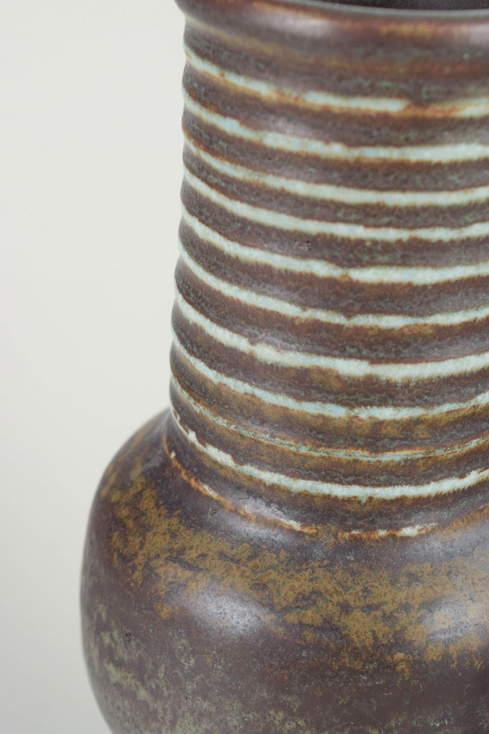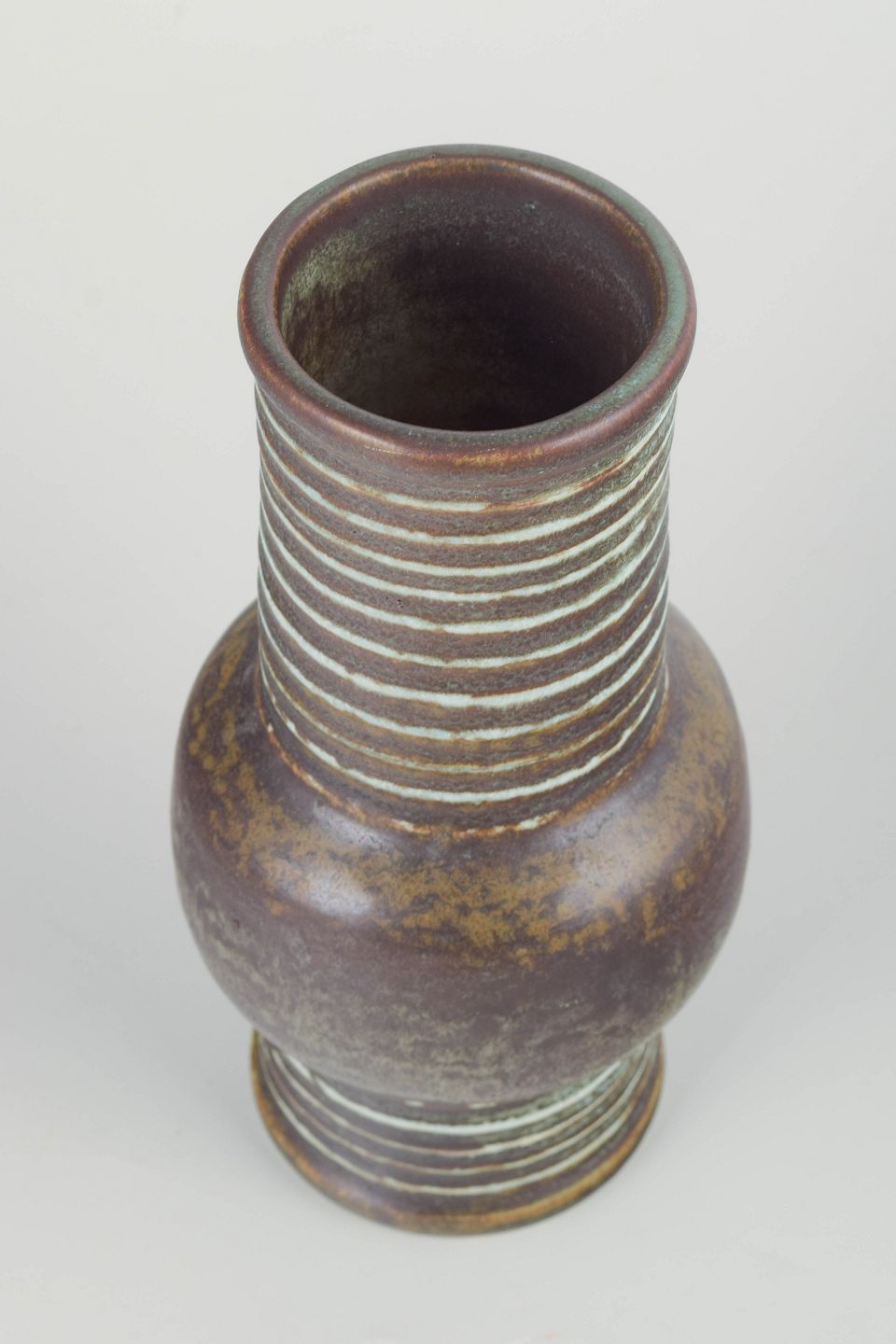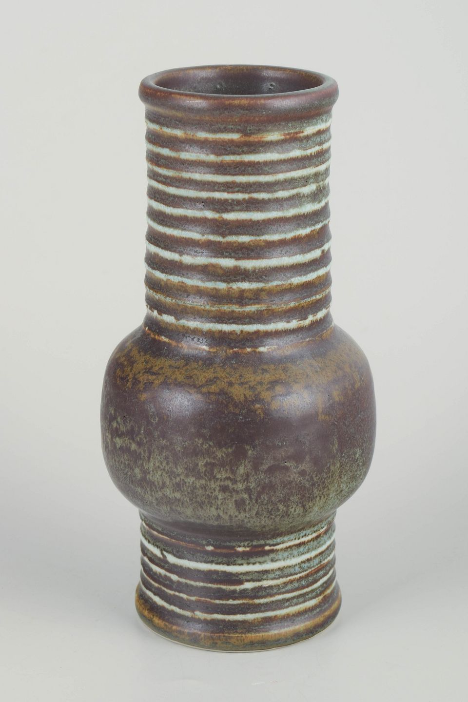 Distinctive cylindrical form with rounded midsection and horizontal incised bands in pale glaze against a deep brown-green ground — a quintessential example from Nylund’s experimental Igloo series.