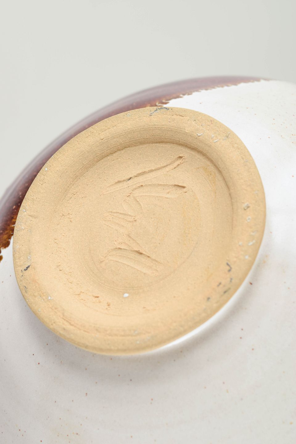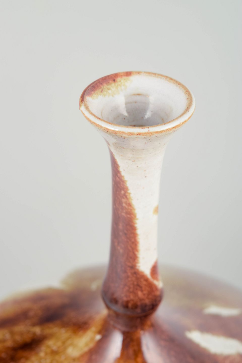 Wheel-thrown stoneware vase with tall slender neck and organic brown flowing glaze over raw white body. One-of-a-kind form, signed by the artist.