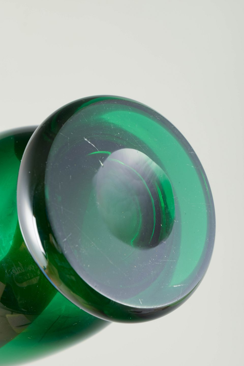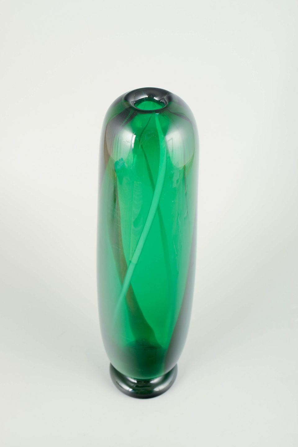 Mouth-blown Scandinavian studio glass with a graduated colour transition from blue to green. Large sculptural double-baluster form with slender neck.