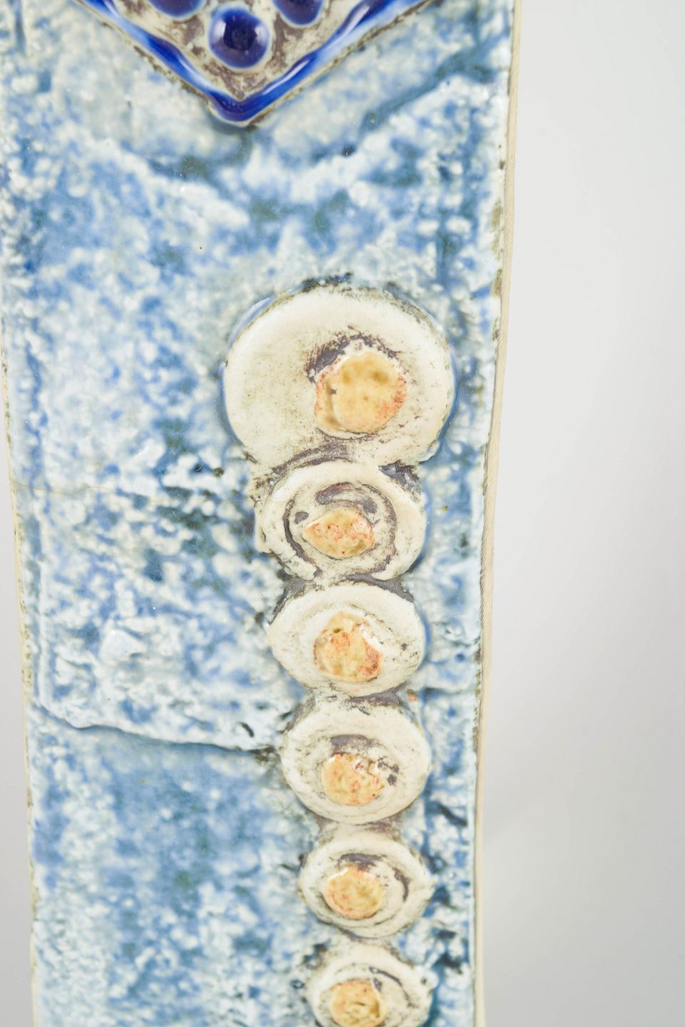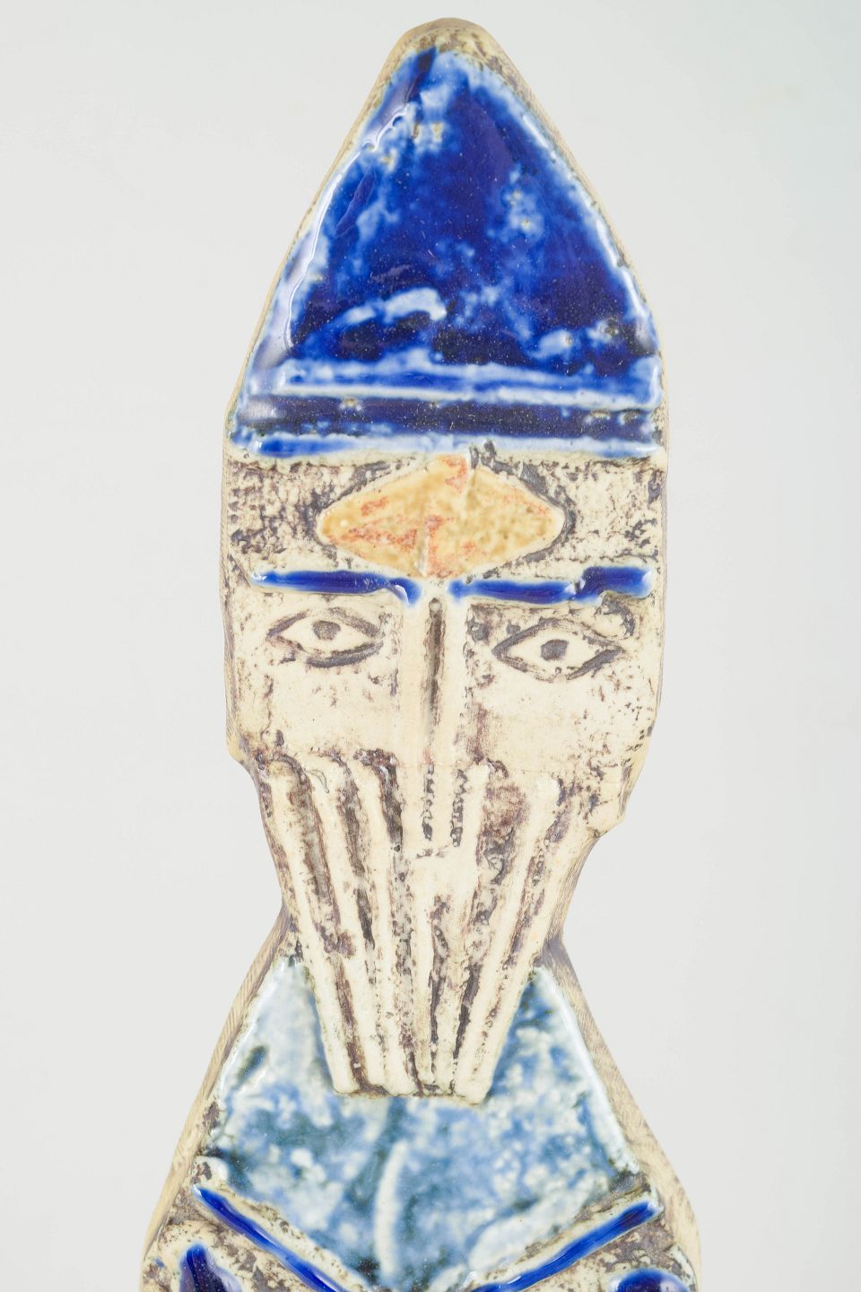 Monumental hand-glazed wall figure in chamotte stoneware depicting her iconic stylized bishop figure in sky blue and deep cobalt glaze with golden highlights. Original hanging device on reverse.