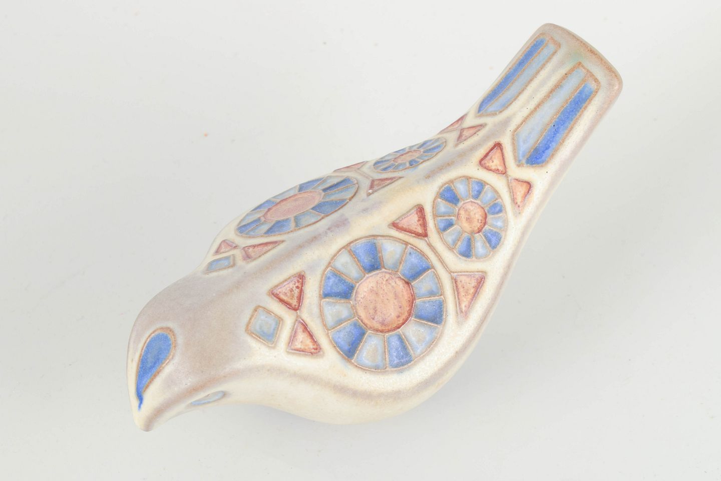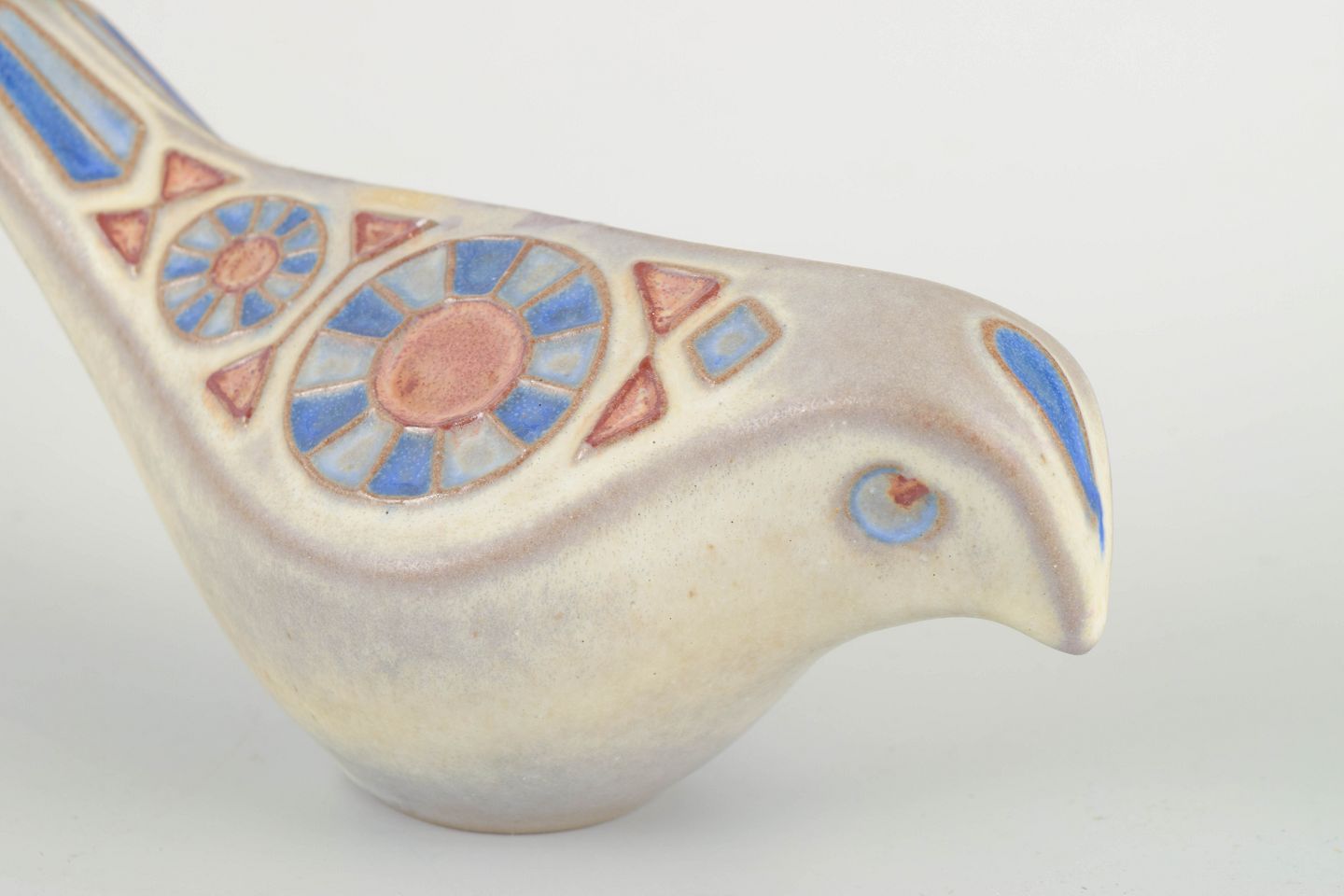Sculptural bird in glazed stoneware with hand-painted floral and geometric decorations in blue and terracotta tones on a light ground. Stamped.