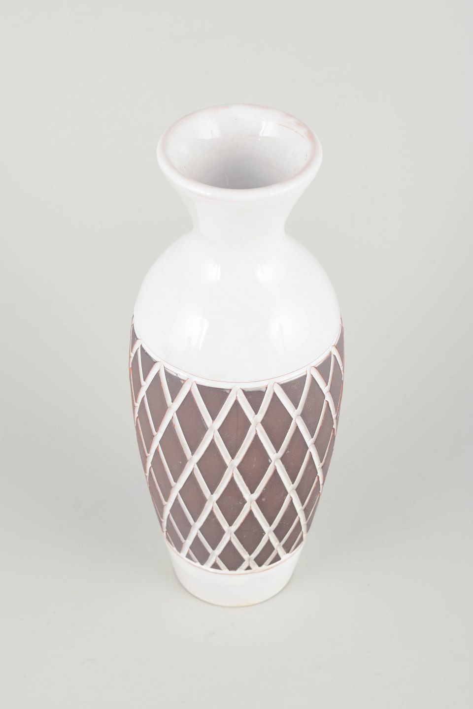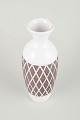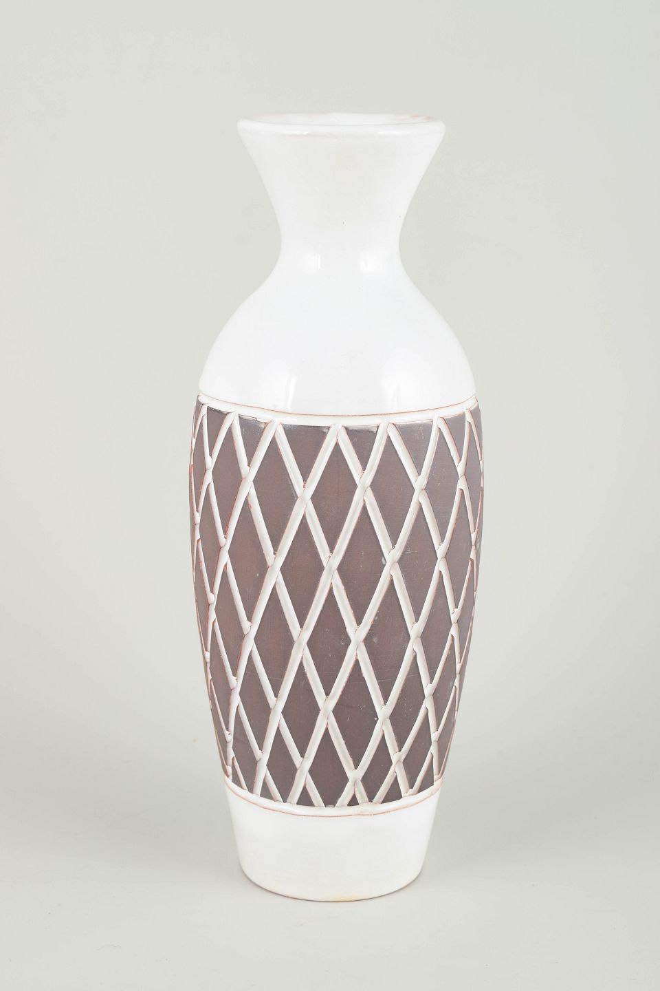 Retro-styled tall vase in glazed faience with white top and base and a geometric hand-decorated panel in a brownish/lilac tone with diagonal lattice pattern.