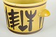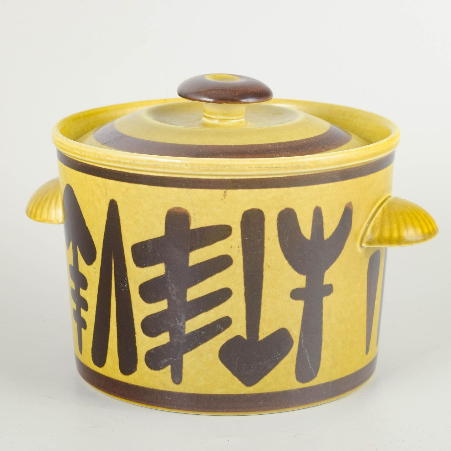 Retro lidded tureen in glazed faience with hand-painted decoration in bold yellow and brown tones, characteristic of the “Pang” series. With original side handles and lid.