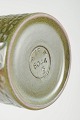 Cylindrical stoneware vase with two-part glaze — the upper half featuring a brown geometric relief grid, and the lower half a light yellow, tactile lava glaze. A classic example of Atterberg’s signature tactile surfaces and Nordic colour sensibility.