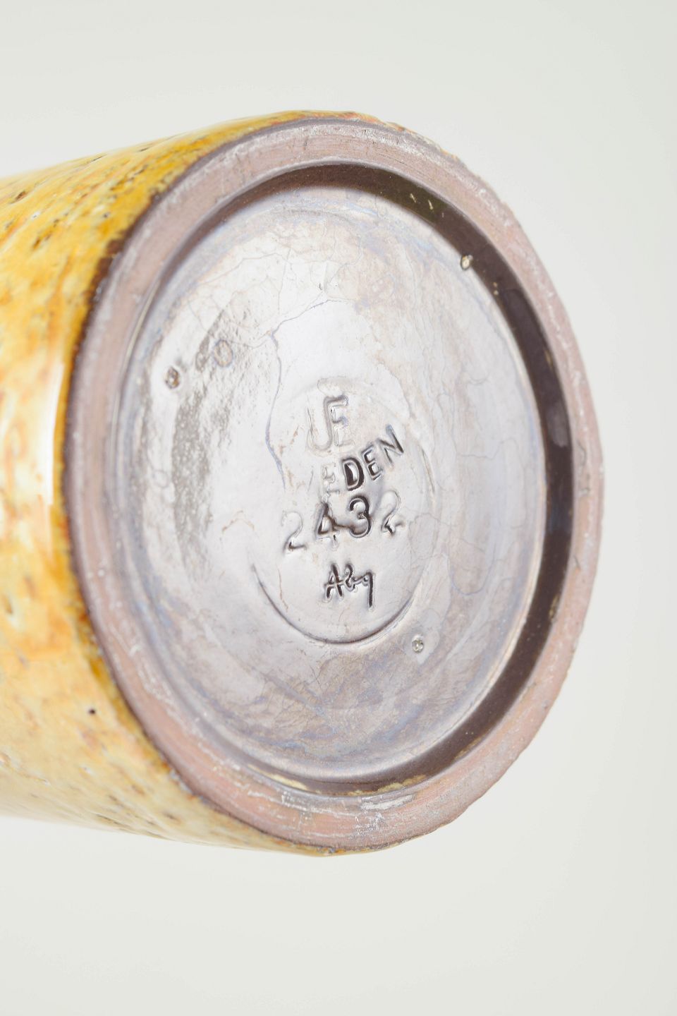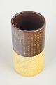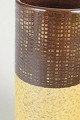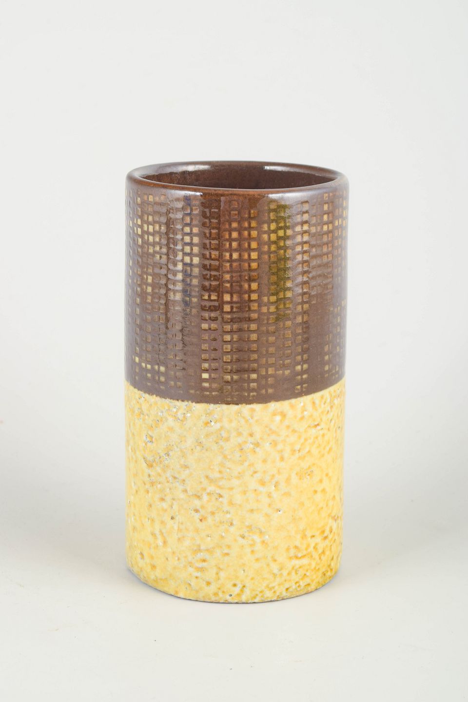 Cylindrical stoneware vase with a two-part glaze — upper section featuring a brown geometric relief texture, and lower part in a light yellow, tactile lava glaze. A strong example of Atterberg’s modernist approach and experimental surface treatments.