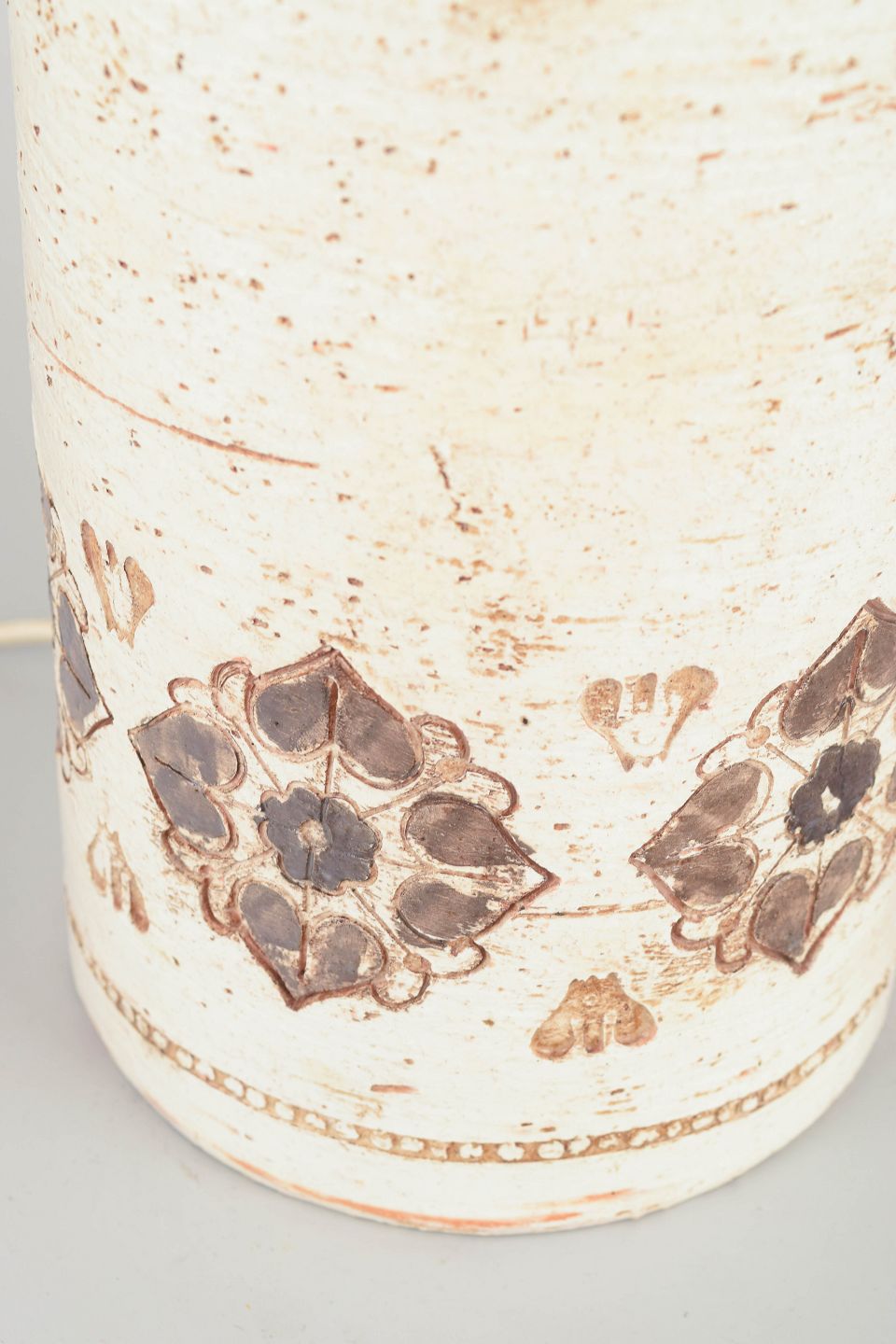 Very large cylindrical table lamp in stoneware with characteristic Bitossi relief and hand-decorated brown ornamental bands on a light crackle-glazed surface.