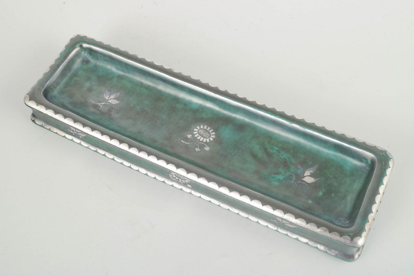 Rectangular Art Deco pen tray in glazed stoneware with Gustavsberg’s signature turquoise Argenta glaze and inlaid silver decorations of stylised floral and leaf motifs.