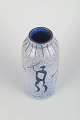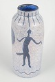 Hand-thrown ceramic vase with relief decoration depicting primitive figures in grey and dark blue glaze. A characteristic piece of Swedish studio pottery with an artistic and figurative expression.