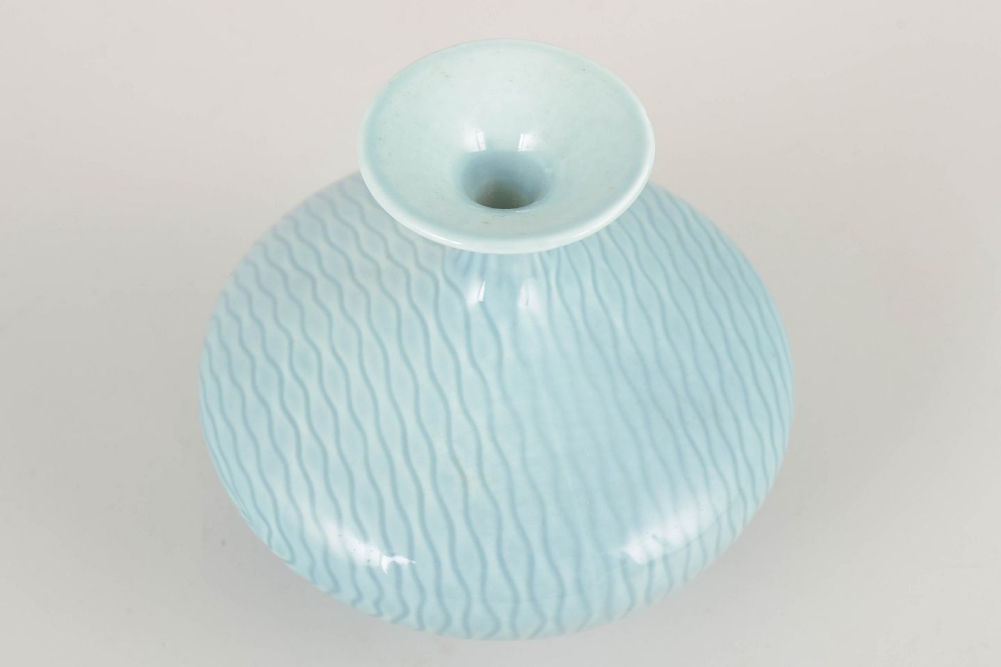 Elegant and organically shaped stoneware vase with a wavy pattern under a turquoise blue glaze. A characteristic example of Nylund’s sculptural balance and subtle glaze effects, embodying timeless Scandinavian design.