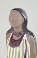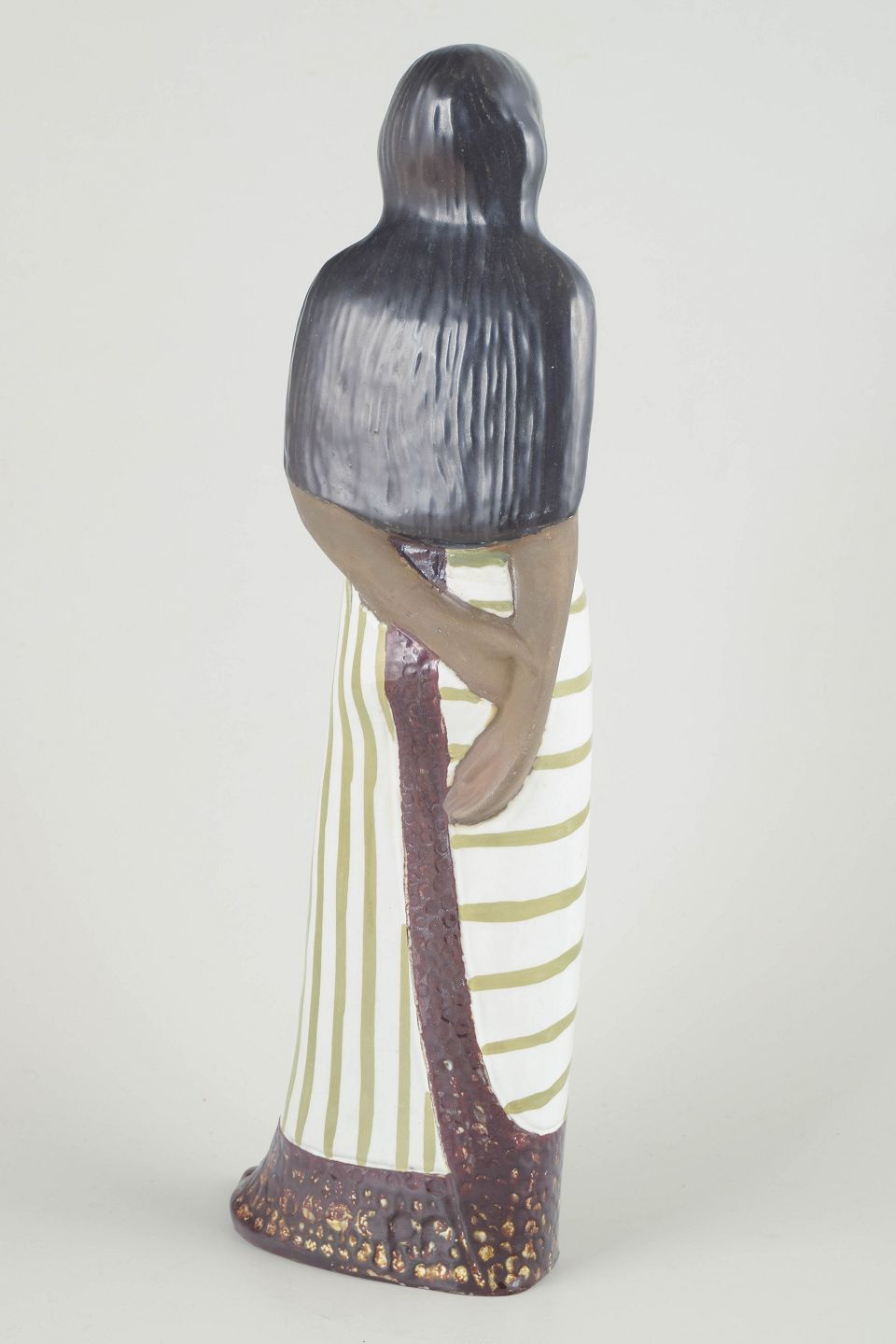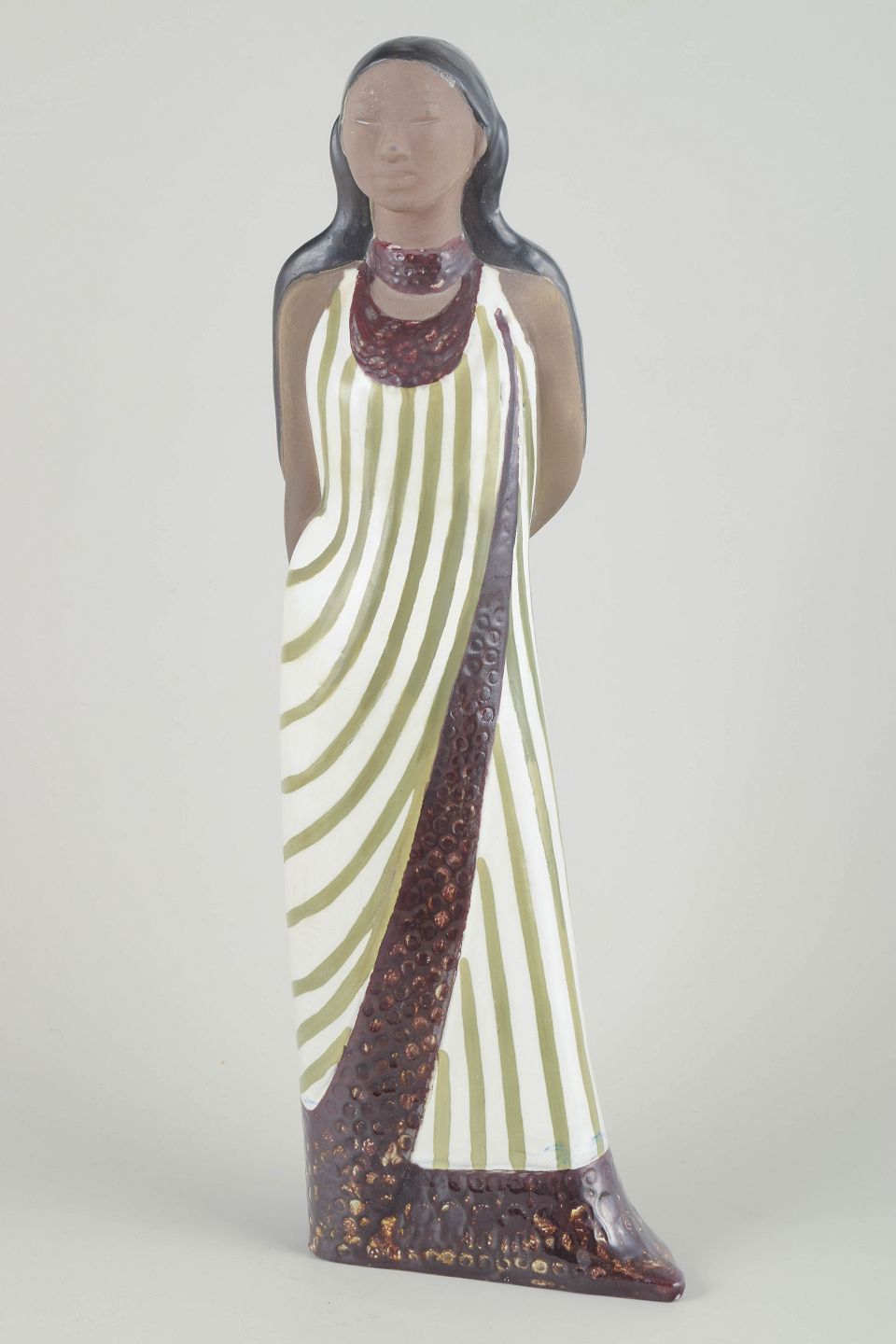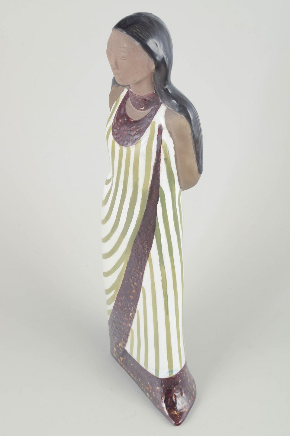 Large hand-painted ceramic figure of a woman with long hair, wearing a white dress with green diagonal stripes and a textured brown border. An elegant and serene work by Mari Simmulson, characterised by her stylised form and warm colour palette.