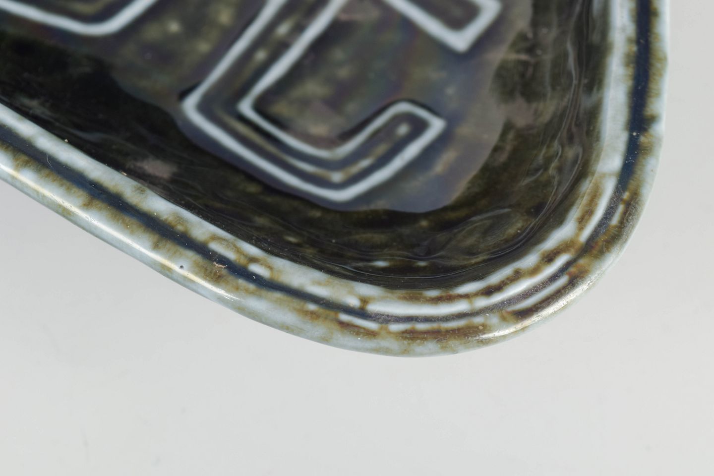 Rare triangular stoneware bowl from the Farina series, designed by Gunnar Nylund. The bowl features a central relief motif and a deep olive-green glaze with beautiful tonal variations — characteristic of Nylund’s elegant and experimental design language at Rörstrand during the 1960s.