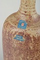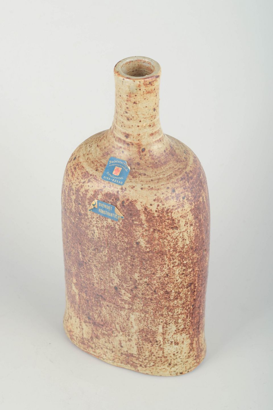 Hand-thrown stoneware vase with a tall neck and rectangular body. Decorated with a rustic speckled glaze in beige and brown tones, typical of Swedish studio ceramics from the period. Retains original labels: Blommenhus Keramik Nyköping and Svenskt Konsthantverk.