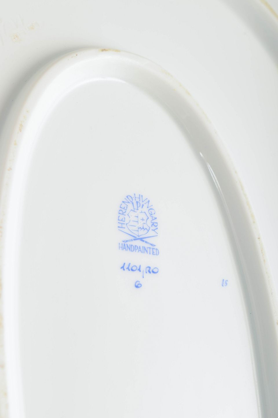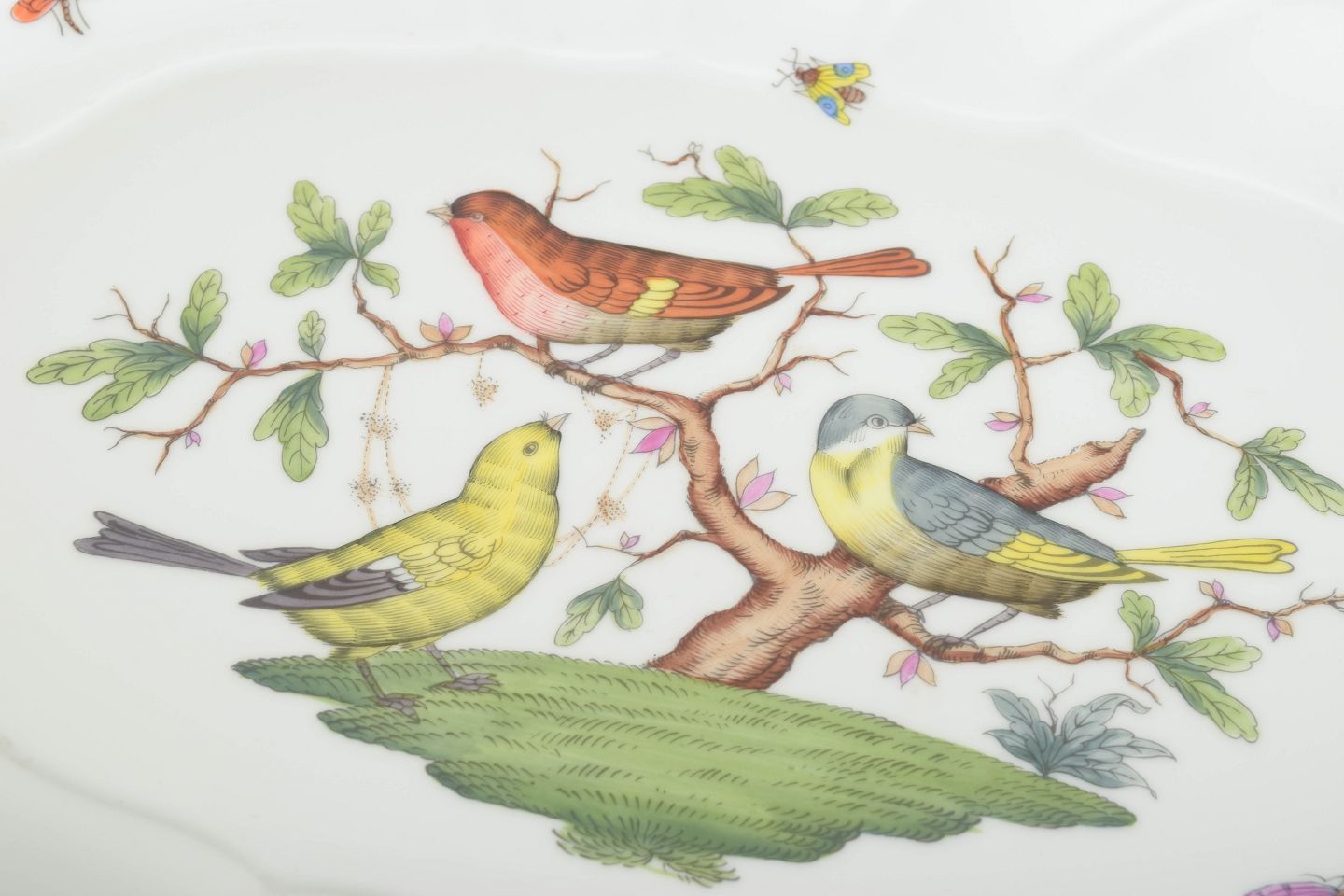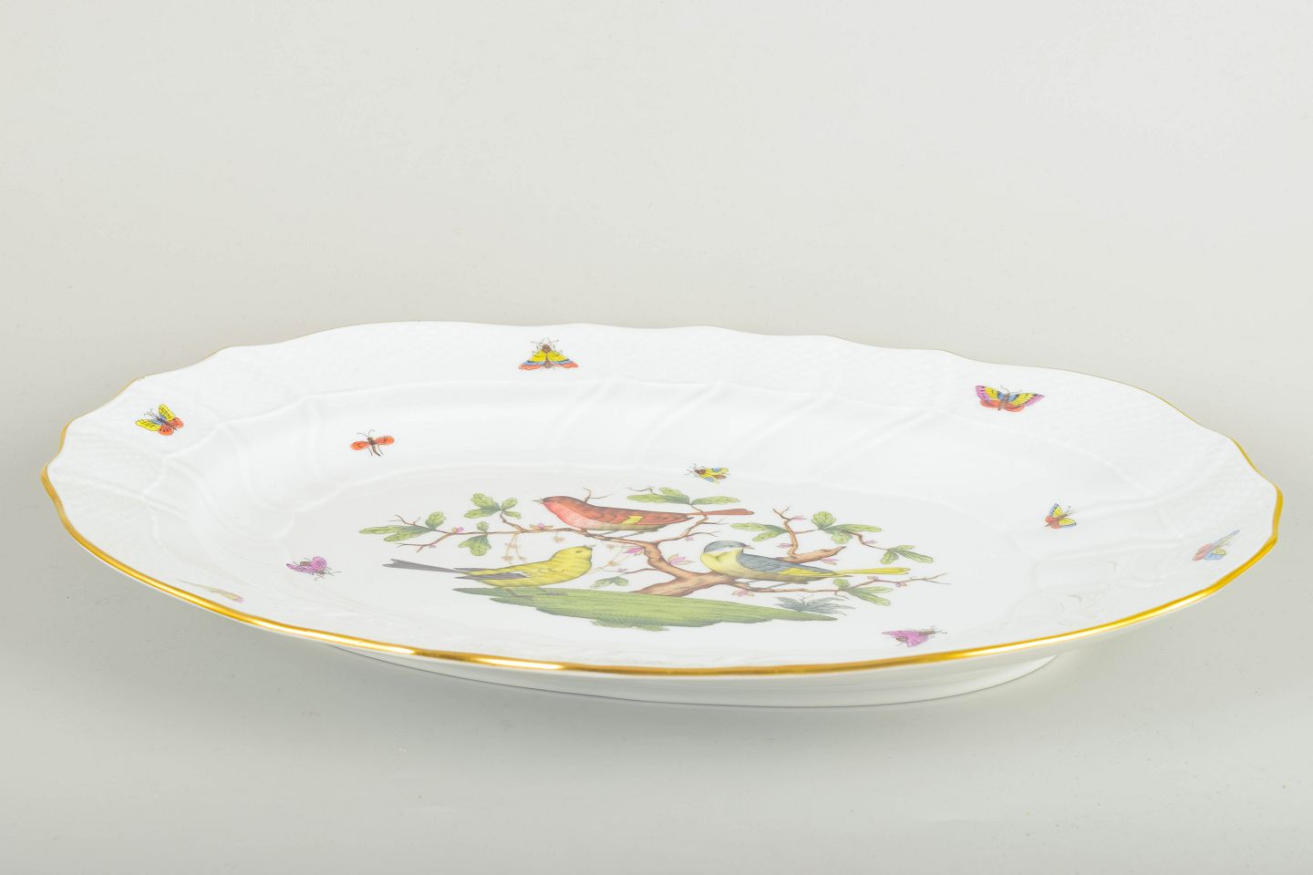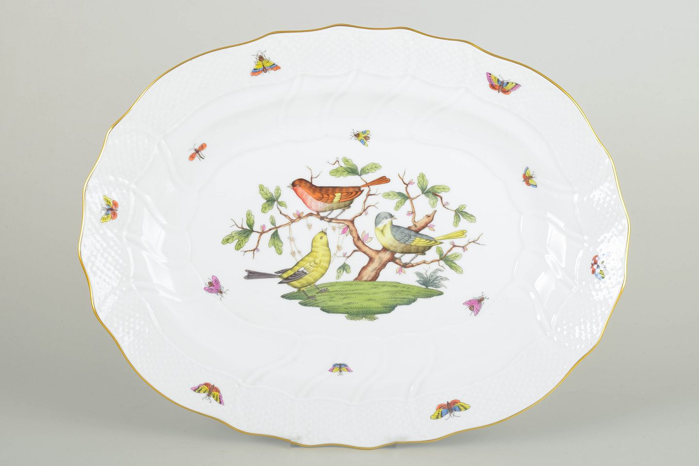 Large oval serving platter in hand-painted porcelain featuring a motif of birds on a branch with butterflies, edged with a gilded rim. A classic Herend decoration with finely detailed brushwork and rich colour tones.