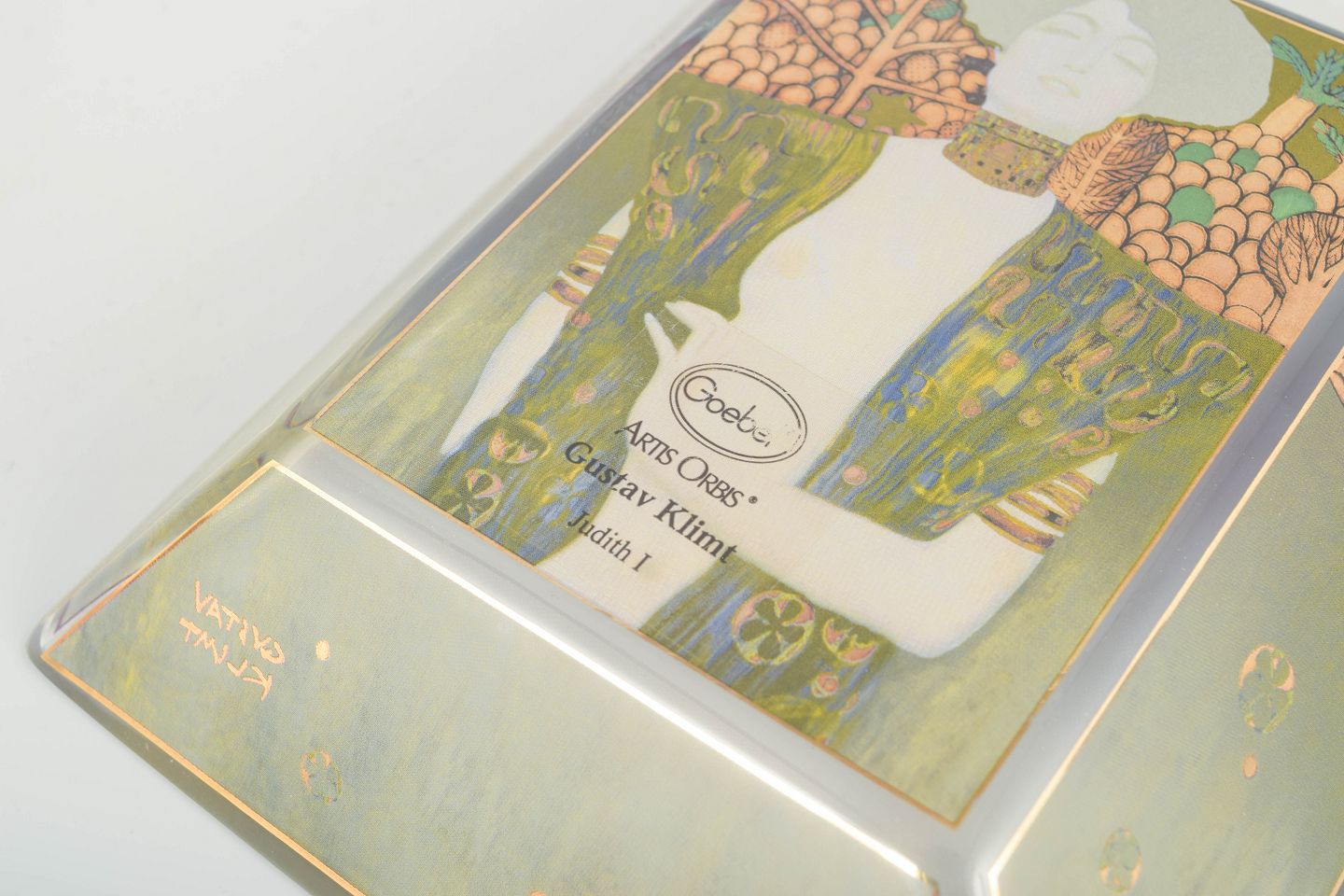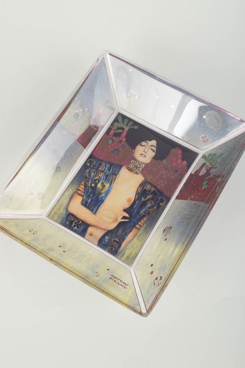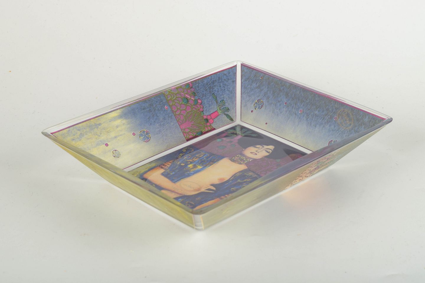 Rectangular glass bowl featuring Gustav Klimt’s famous Judith I (1901) motif, executed in iridescent glass with printed decoration and metallic shimmer in gold, blue, and red tones.