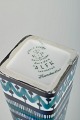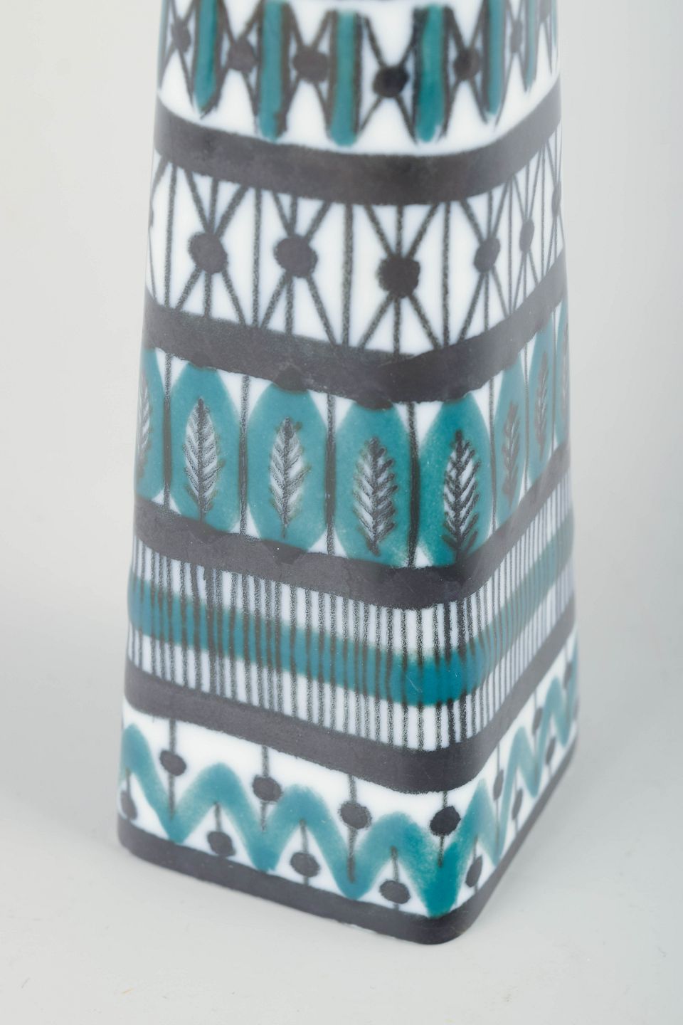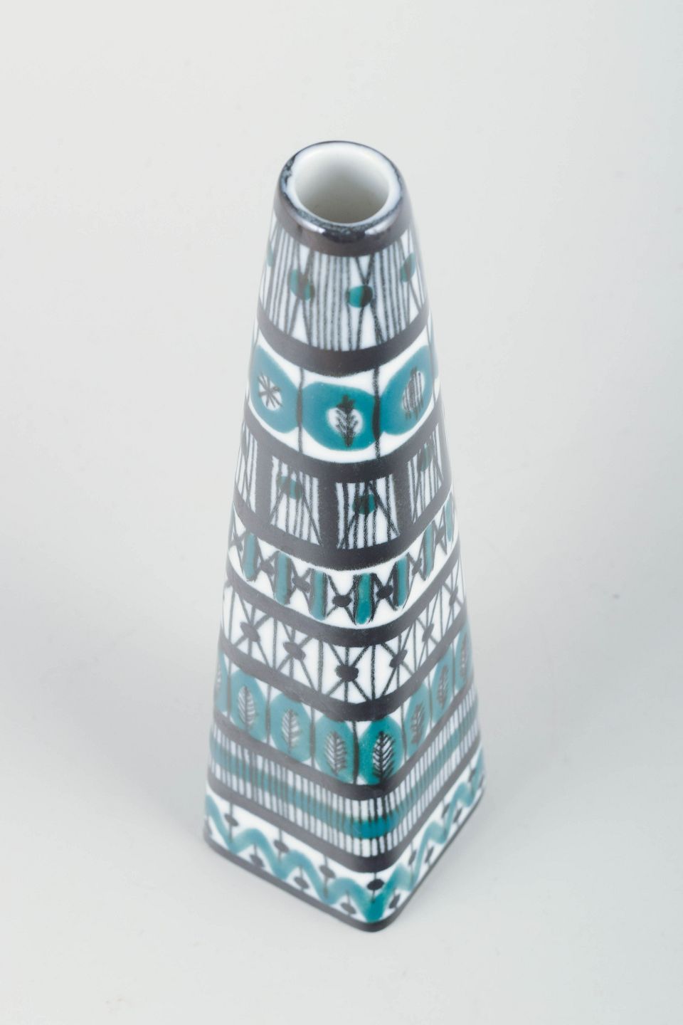 Hand-painted conical faience vase with geometric decoration in turquoise, black and white tones. A characteristic example of Swedish 1950s/60s design with a distinctly modernist aesthetic.