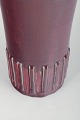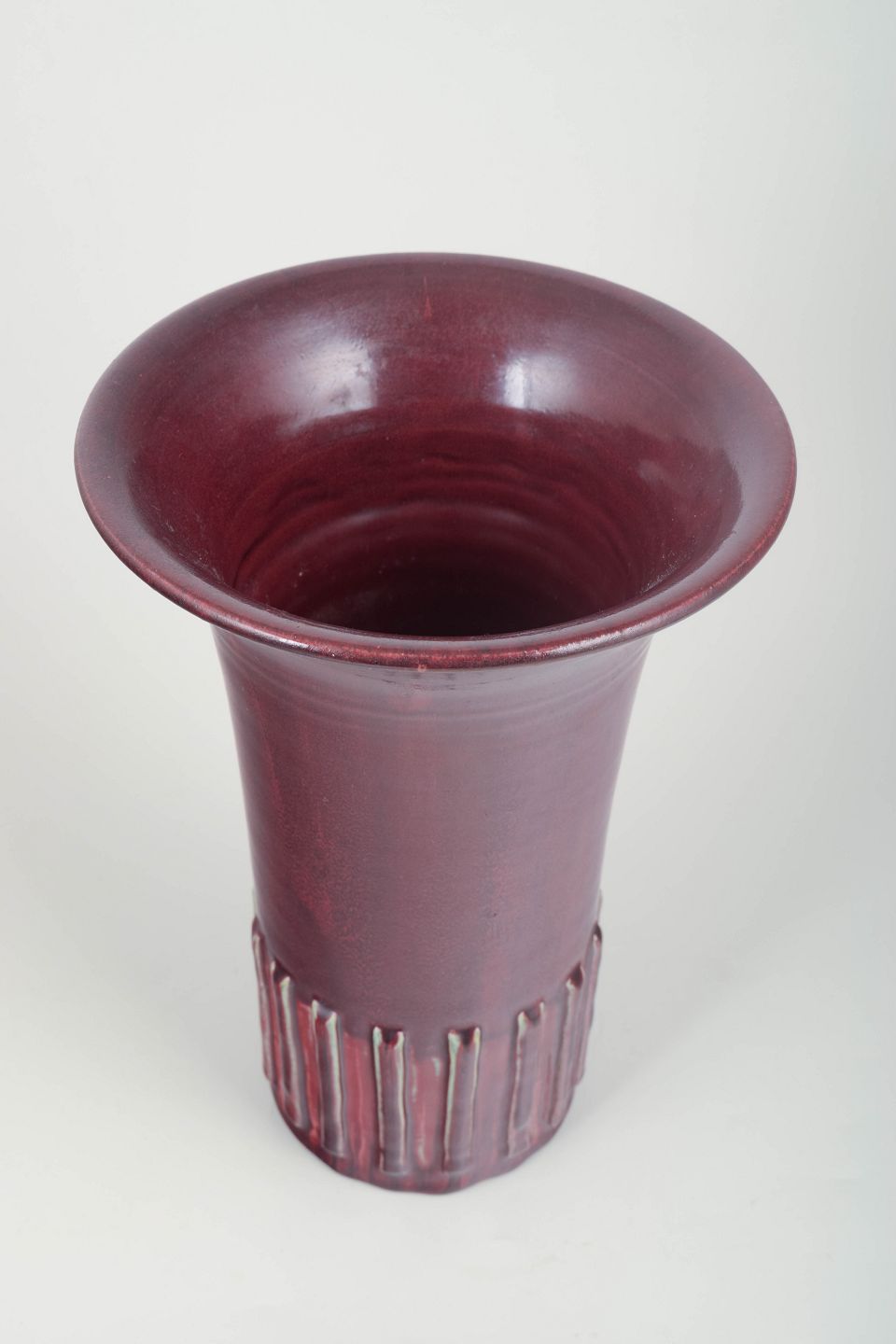 Impressive cone-shaped vase in stoneware with a deep, saturated oxblood glaze and vertical relief ribs around the lower section.