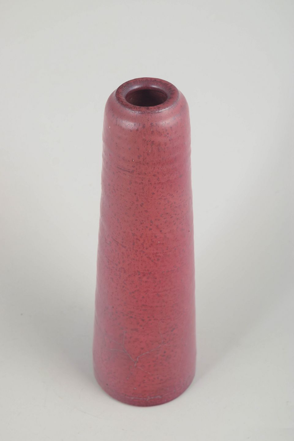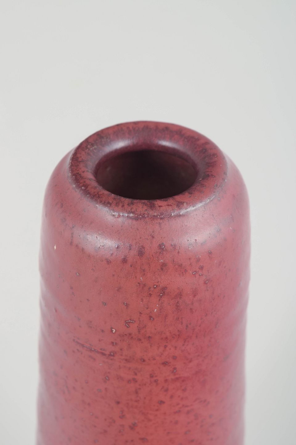 Large, hand-glazed vase in the classic Mobach style with a cylindrical, gently tapered form and a deep red glaze with subtle surface variation. A striking and decorative piece from the workshop’s 1970s production.